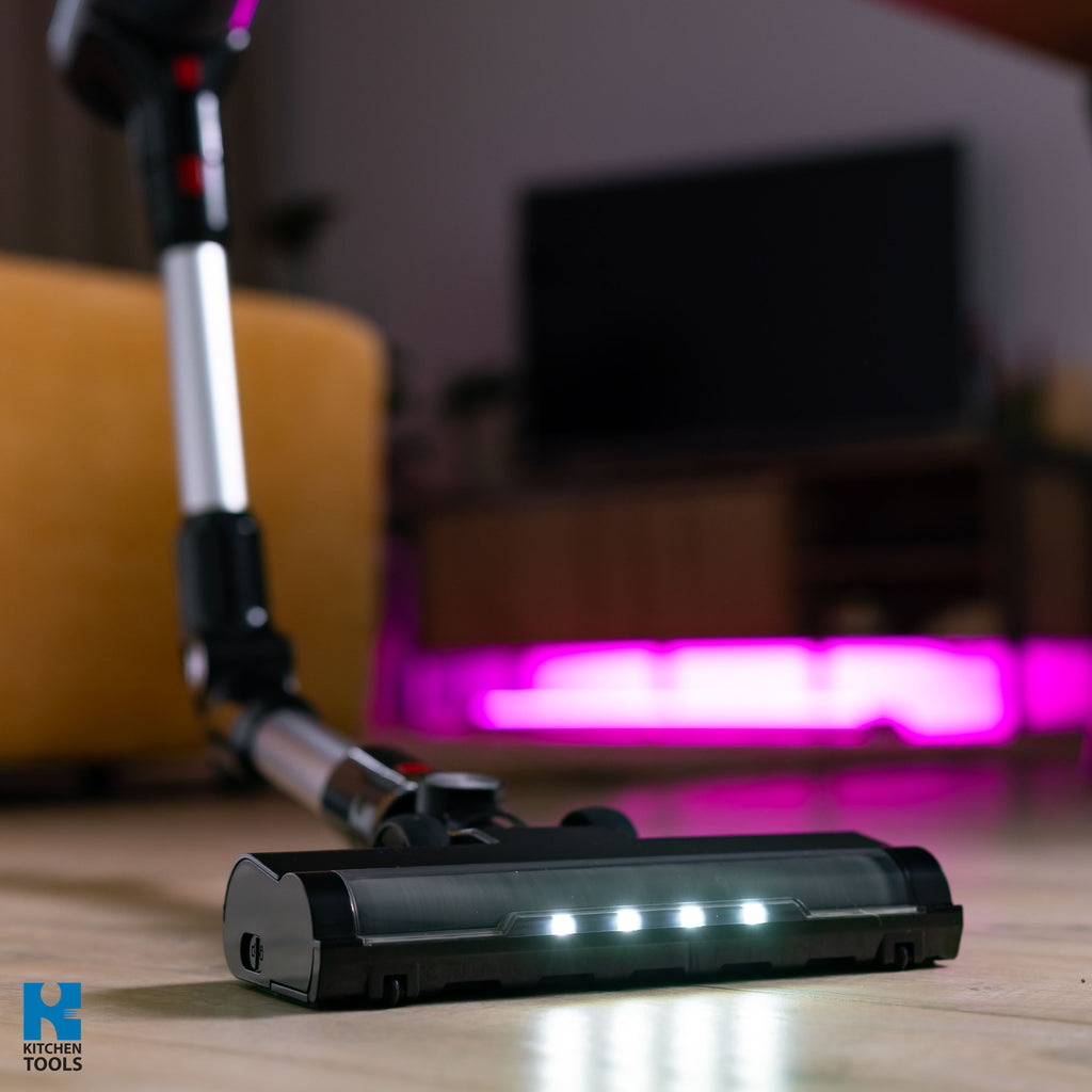 Perie electrică pentru podea cu iluminare LED: aceasta este cea mai utilizată componentă a aspiratorului. Fie că este vorba de firimituri în covor, murdărie pe podea, păr fin de la animalele de companie sau păr în general, nu va lăsa nimic în urmă. Sistemul inteligent de anti-încurcare a părului reduce timpul petrecut pentru aspirare cu până la 30%.