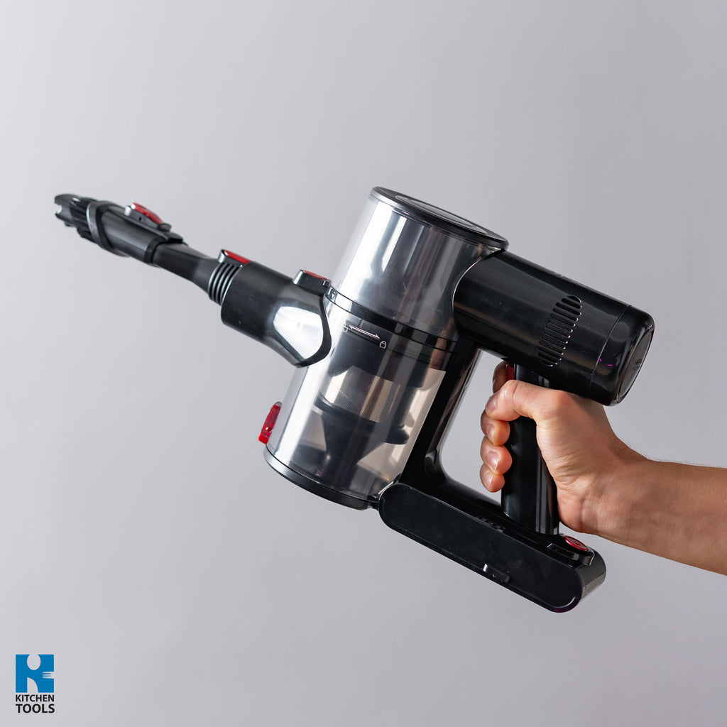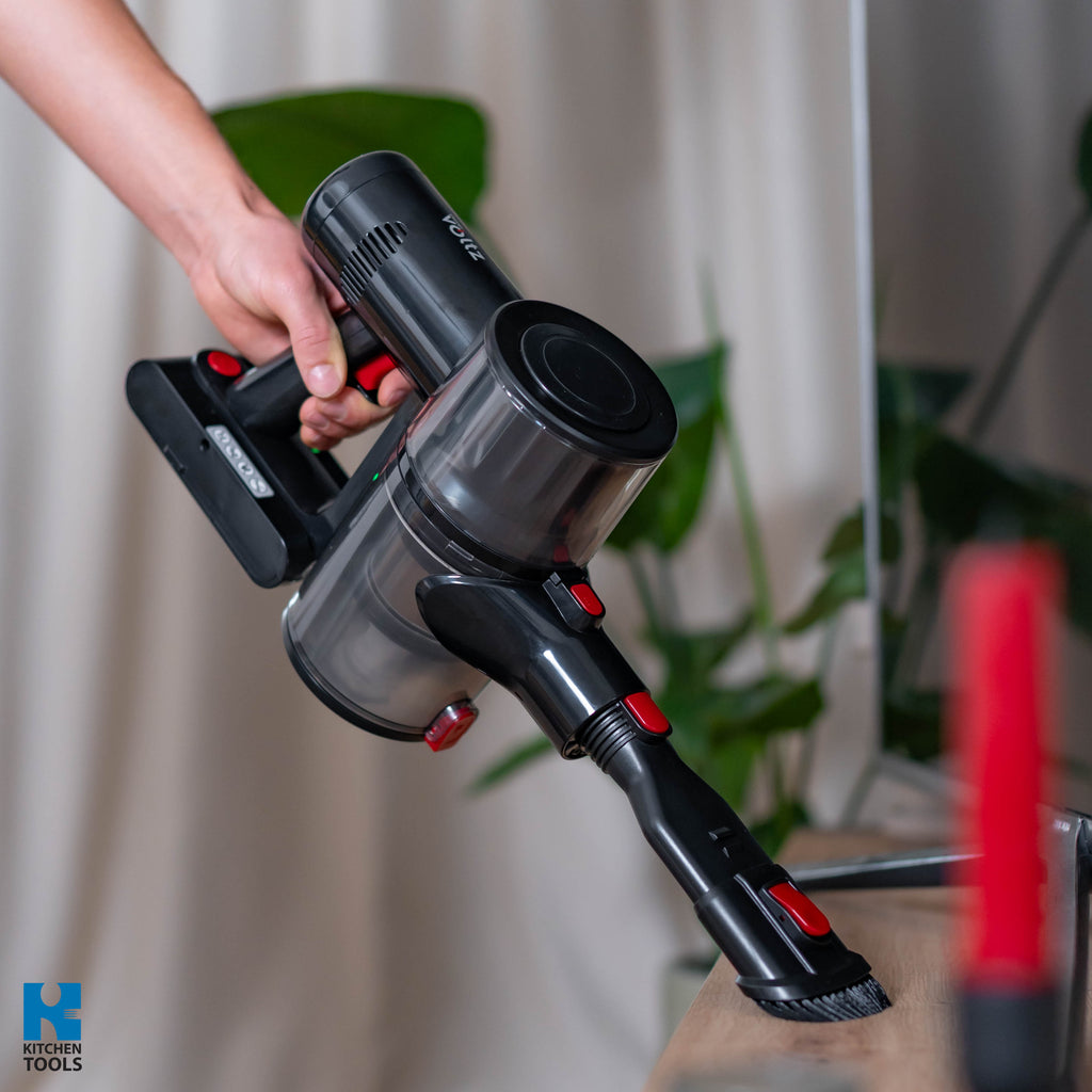 Aspirator cu acumulator Oliver Voltz 2‑în‑1 – aspirator cu baterie, fără sac, cu tehnologie ciclonică, iluminare LED, aspirator wireless cu diverse atașamente, perie turbo, display LED, filtru HEPA, dustbuster wireless, nivel de zgomot 72 dB.