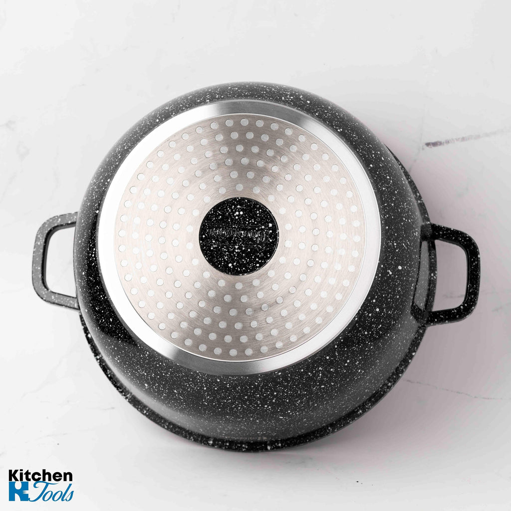 - Acoperire ceramică marmorată: Suprafața interioară este acoperită cu un strat ceramic marmorat, oferind o rezistență crescută la lipire și facilitând gătitul fără grăsimi.