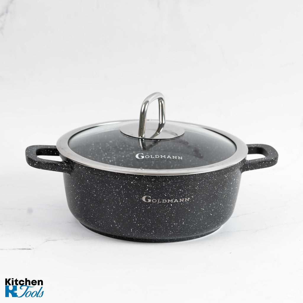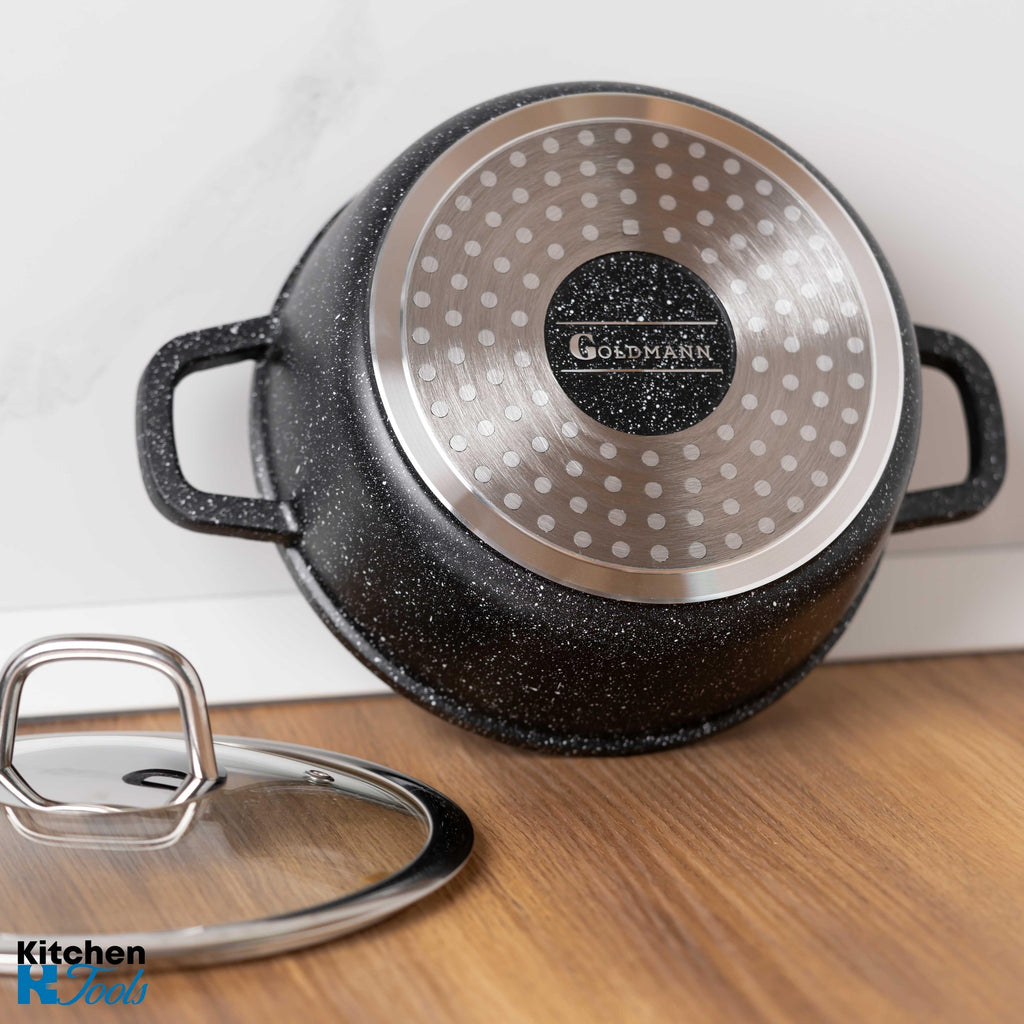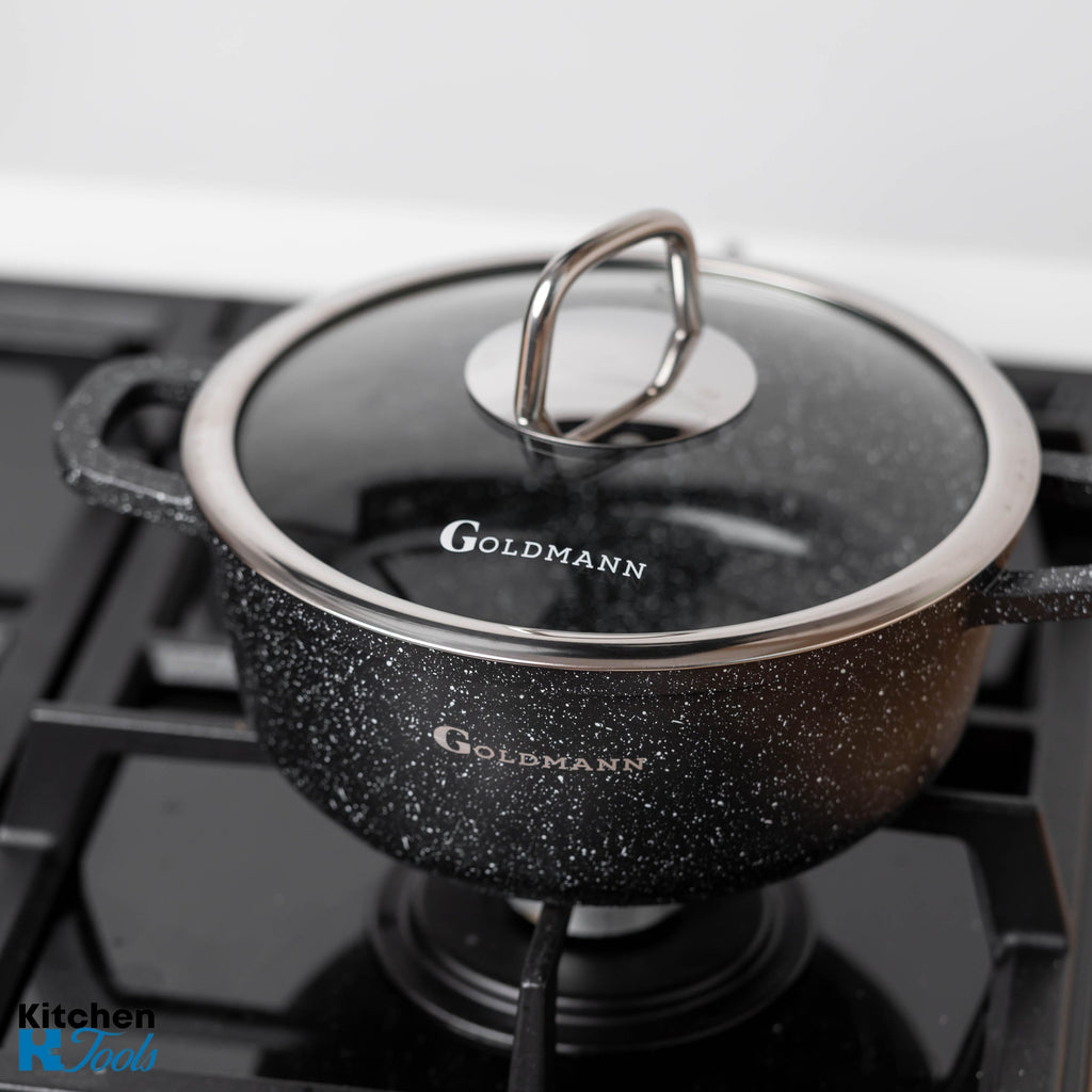 - Acoperire ceramică marmorată: Suprafața interioară a cratiței este acoperită cu un strat ceramic marmorat, oferind o rezistență crescută la lipire și facilitând gătitul fără grăsimi.