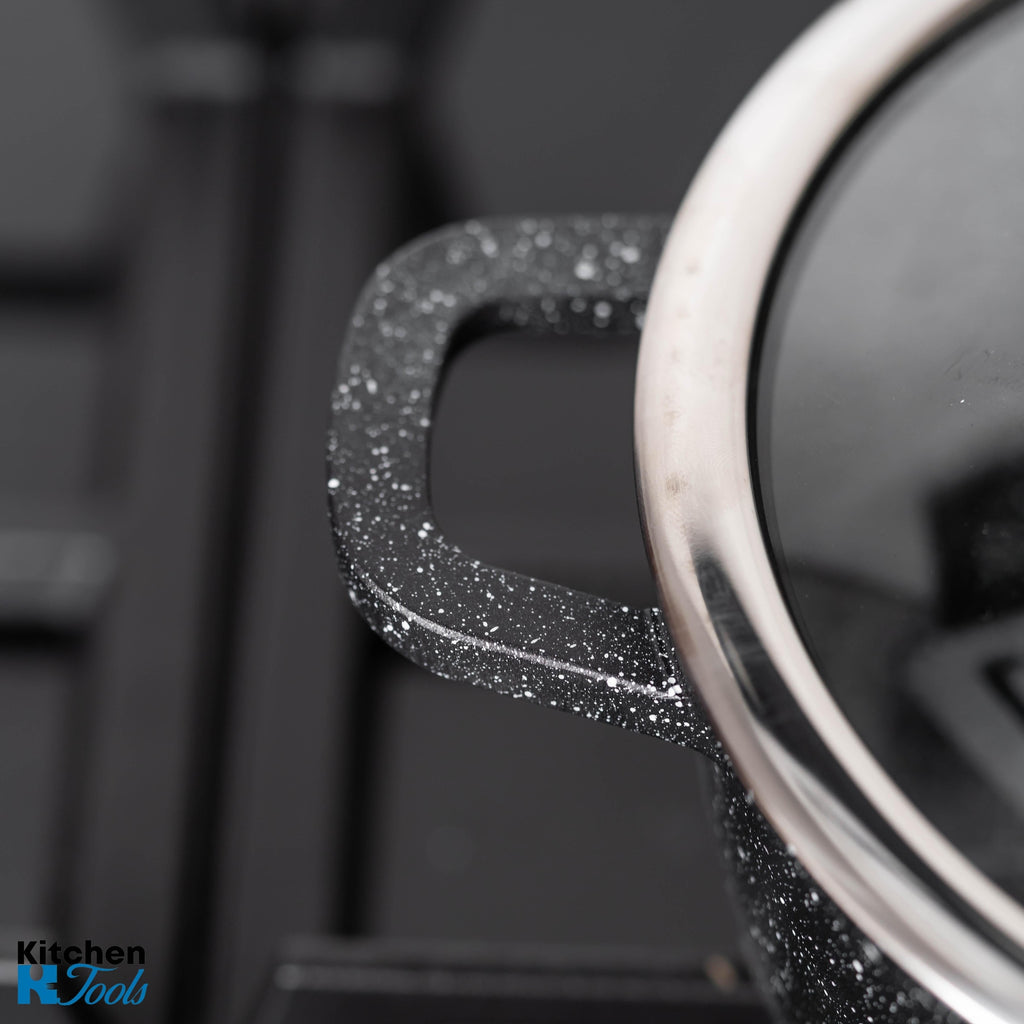 - Acoperire ceramică marmorată: Suprafața interioară este acoperită cu un strat ceramic marmorat, oferind o rezistență crescută la lipire și facilitând gătitul fără grăsimi.