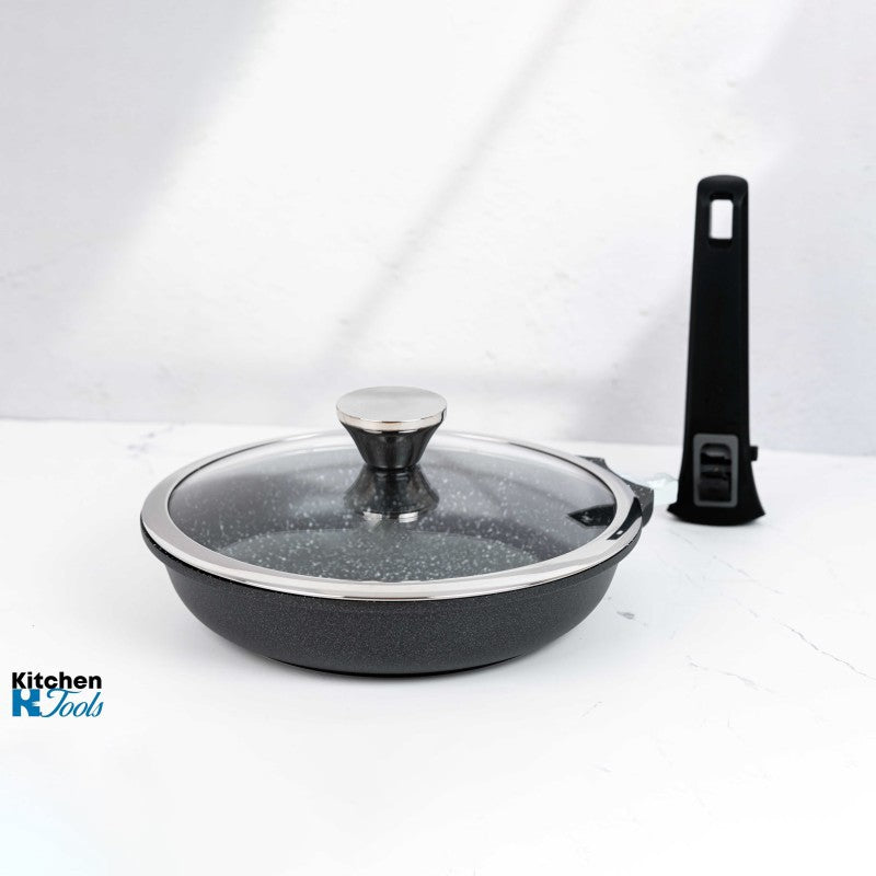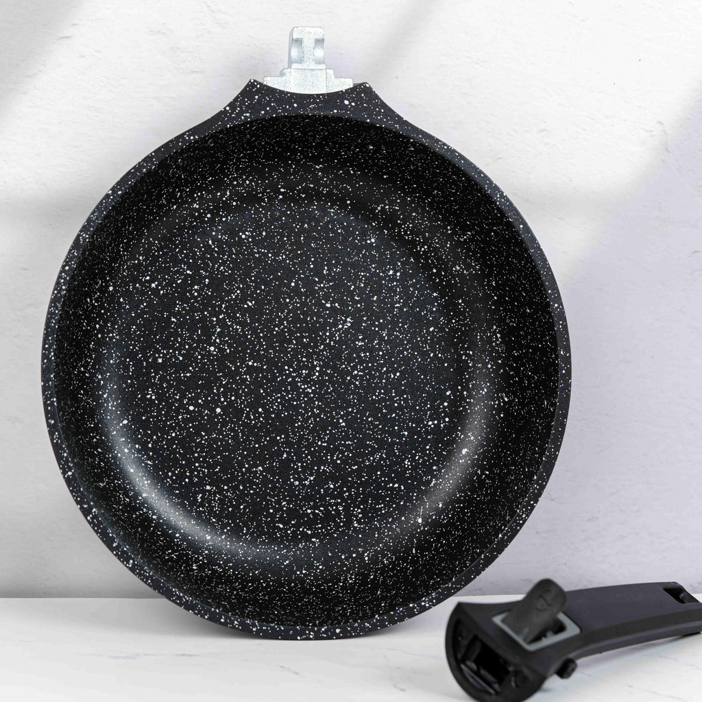- Mânere detașabile pentru confort maxim: Mânerele detașabile sunt concepute pentru a vă oferi flexibilitate în timpul gătitului. Această funcționalitate vă permite să transferați tigaia direct de pe plită la masă sau să o depozitați cu ușurință în spații restrânse.