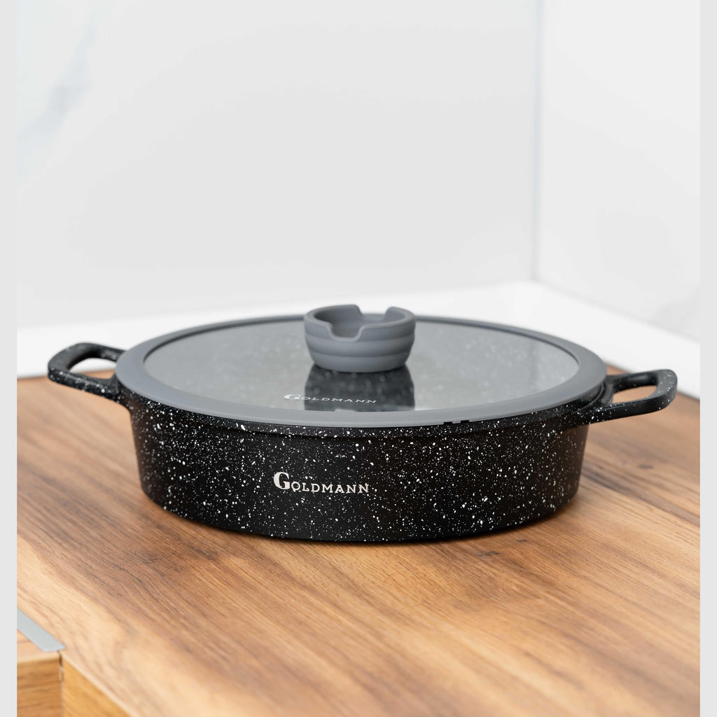 Ideală pentru gătitul lent, sotarea și braisarea preparatelor voluminoase. Această cratiță de la Goldmann combină rezistența aluminiului turnat (material cu o distribuție termică excepțională) cu eficiența modernă a stratului antiaderent.