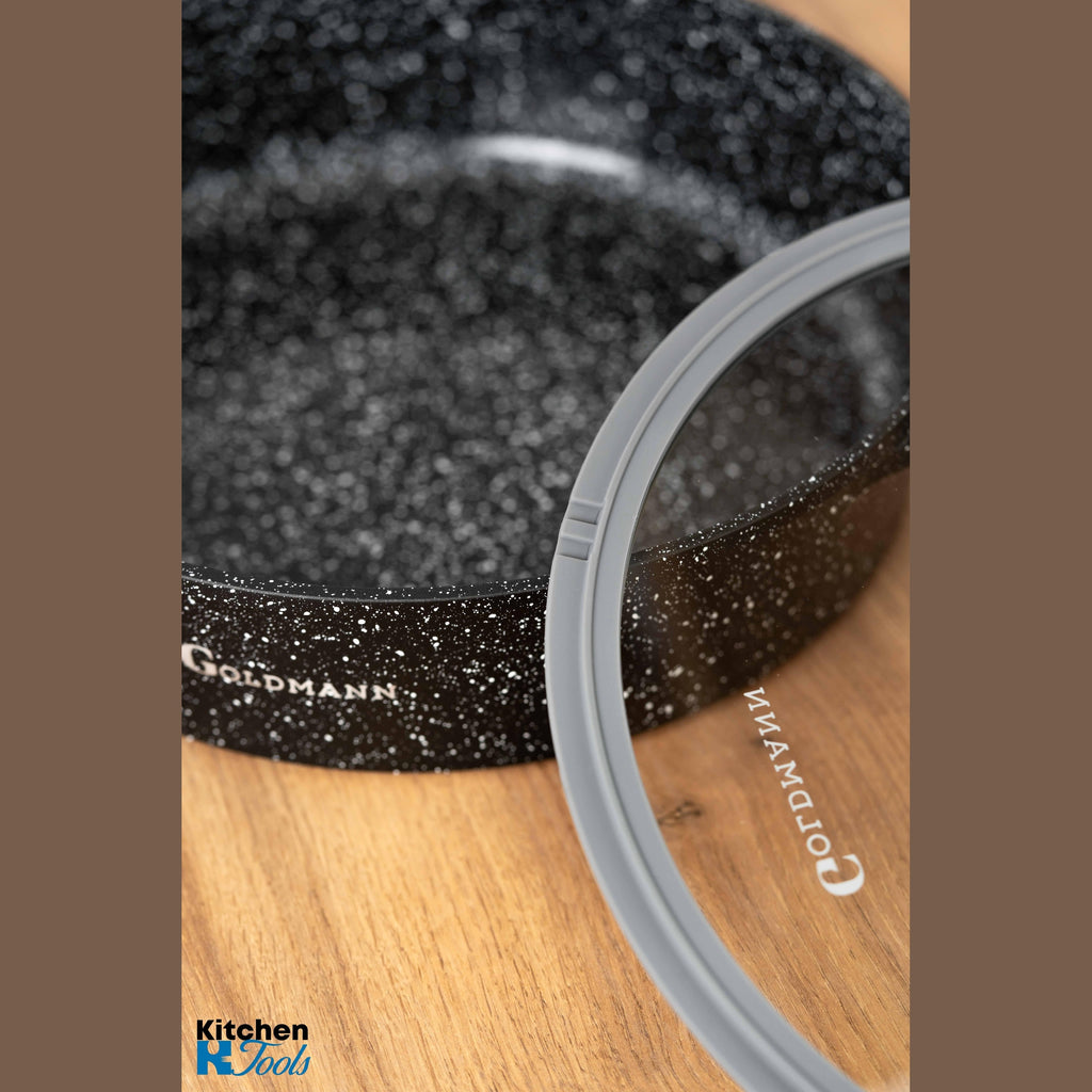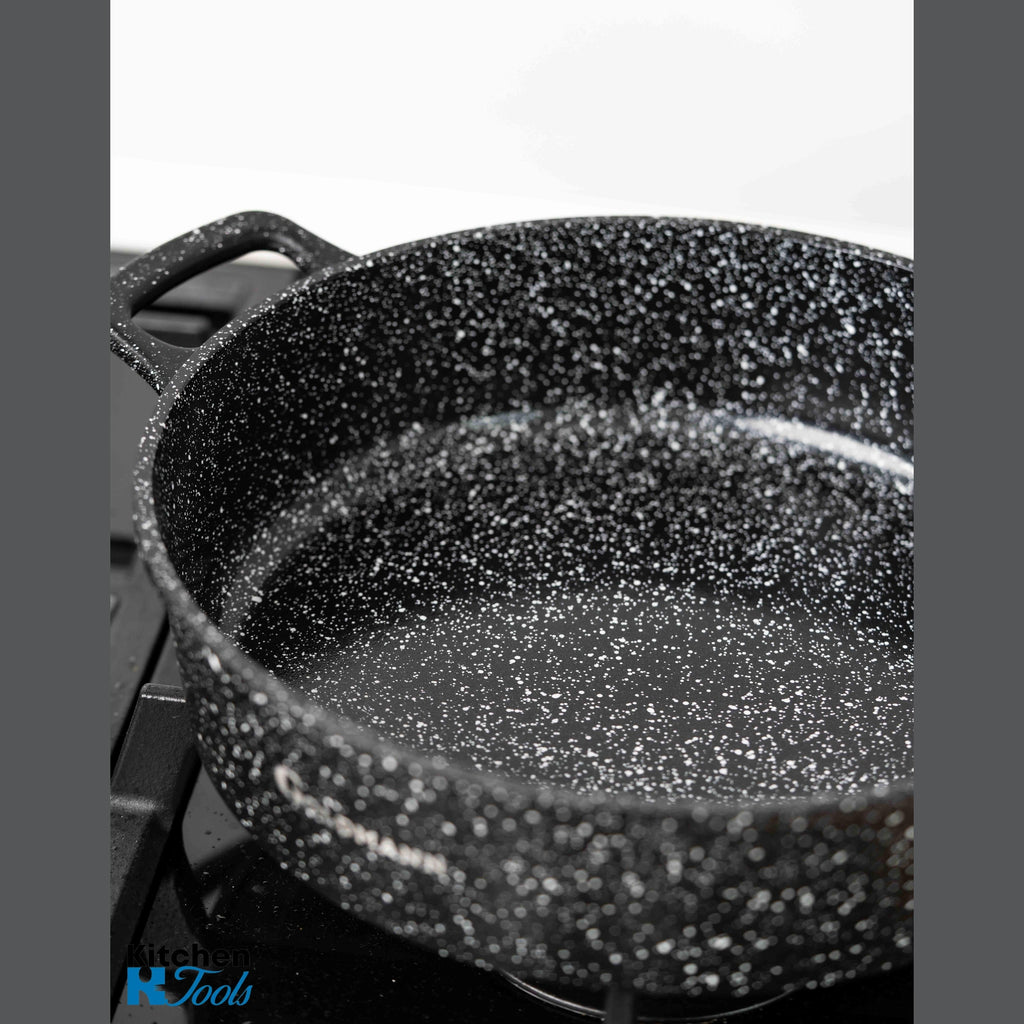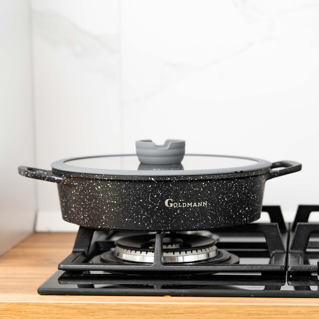 - Profil lat (28 cm): Suprafața largă este perfectă pentru a rumeni carnea înainte de a adăuga lichidul (efect Maillard), esențial pentru tocane și preparate de tip one-pot.