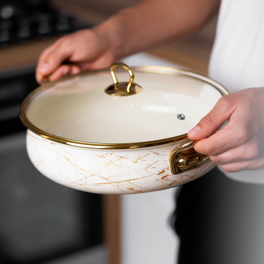 - Capac din sticlă termorezistentă: Setul include un capac din sticlă termorezistentă, care permite monitorizarea preparatelor fără a fi nevoie să îl ridici. Astfel, se păstrează aroma și nutrienții alimentelor, garantând rezultate delicioase.