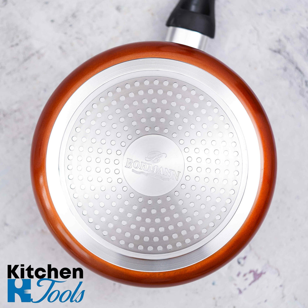 Corpul este fabricat din aluminiu cu o grosime robustă de 2.5 mm, care asigură o încălzire rapidă și uniformă, prevenind lipirea, un risc frecvent la preparatele delicate. Interiorul acoperit cu un strat marmorat (granit) de înaltă performanță garantează că mâncarea nu se lipește și simplifică la maximum curățarea.