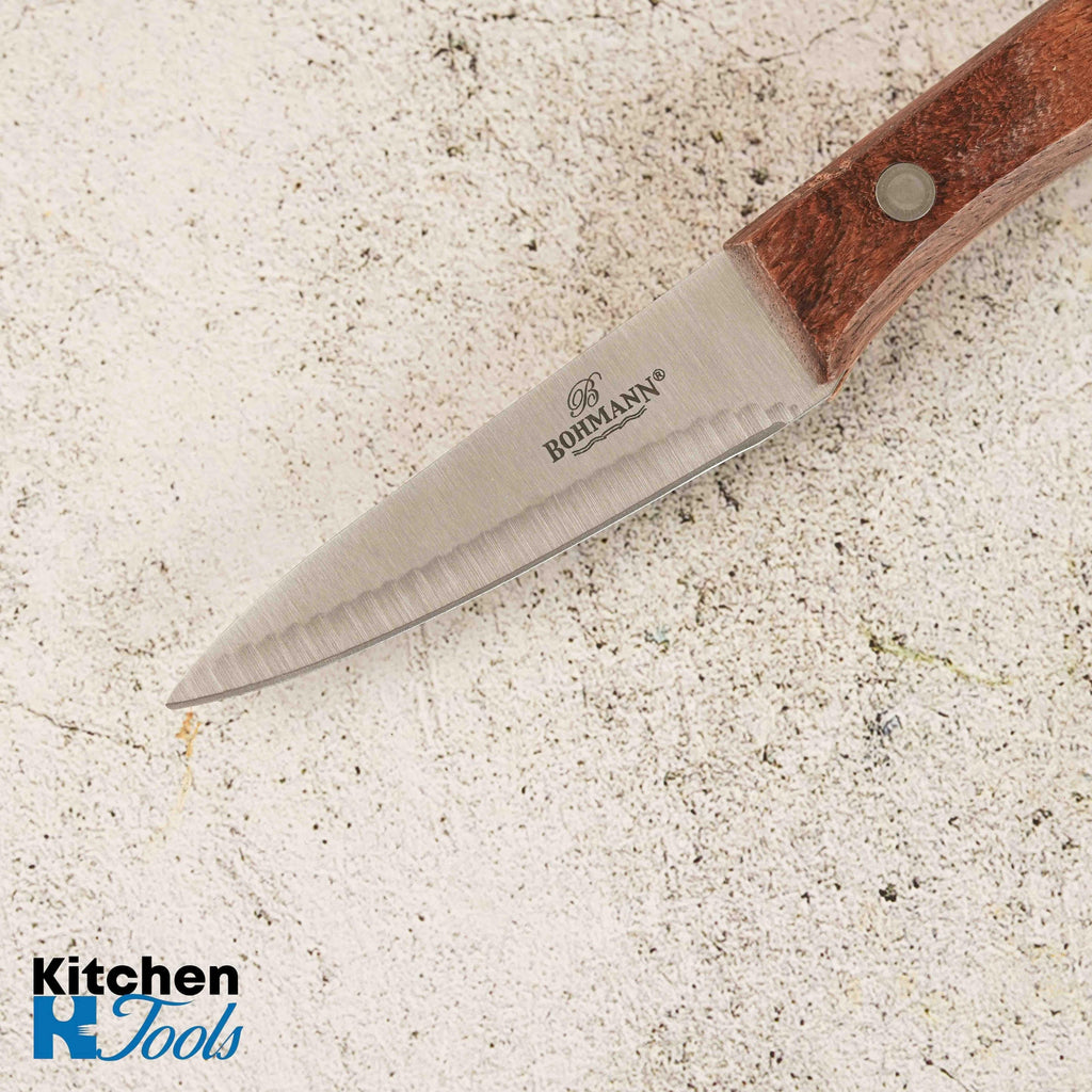 Pentru sarcinile care necesită finețe și control maxim, cuțitul de decojit Bohmann de 9 cm este alegerea perfectă. Lama mică, dar ascuțită, este ideală pentru a decoji cartofii, fructele sau legumele mici, pentru a îndepărta cotoarele sau pentru a realiza garnituri decorative.