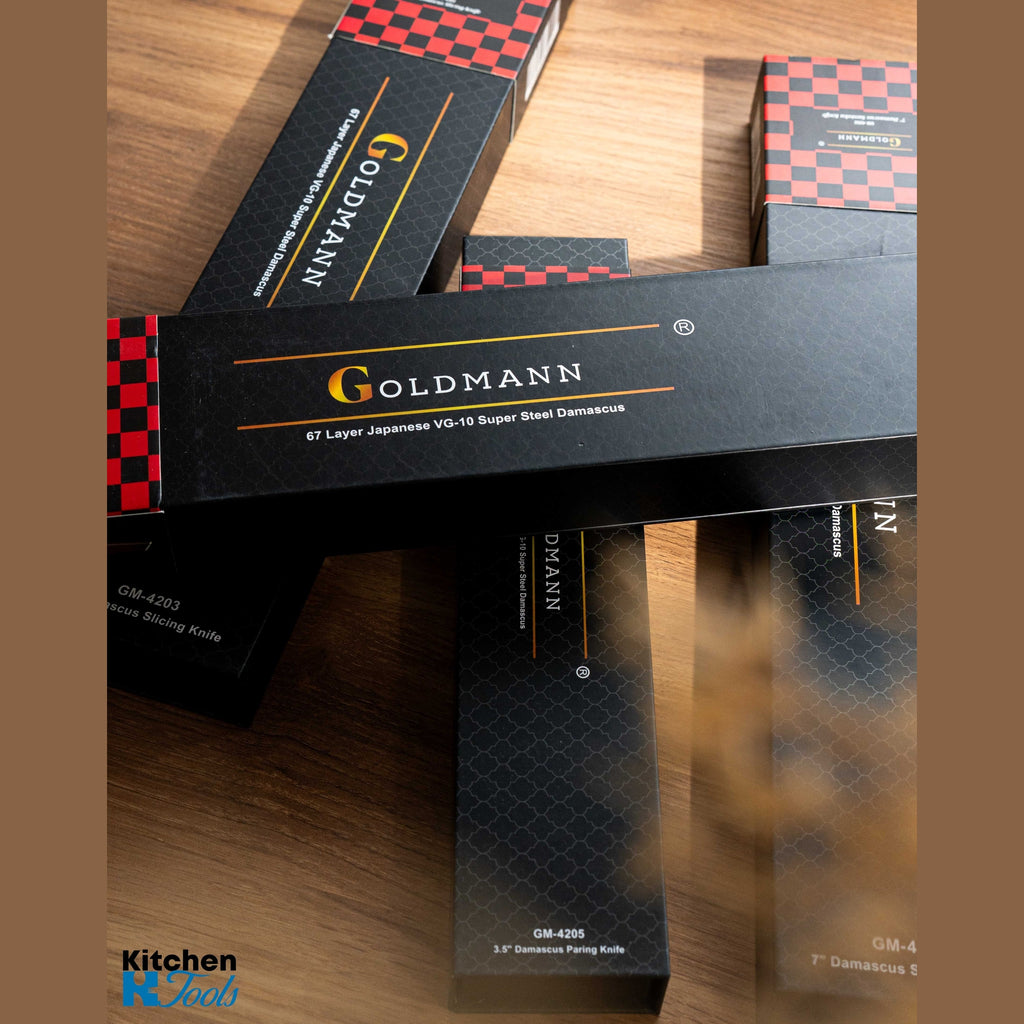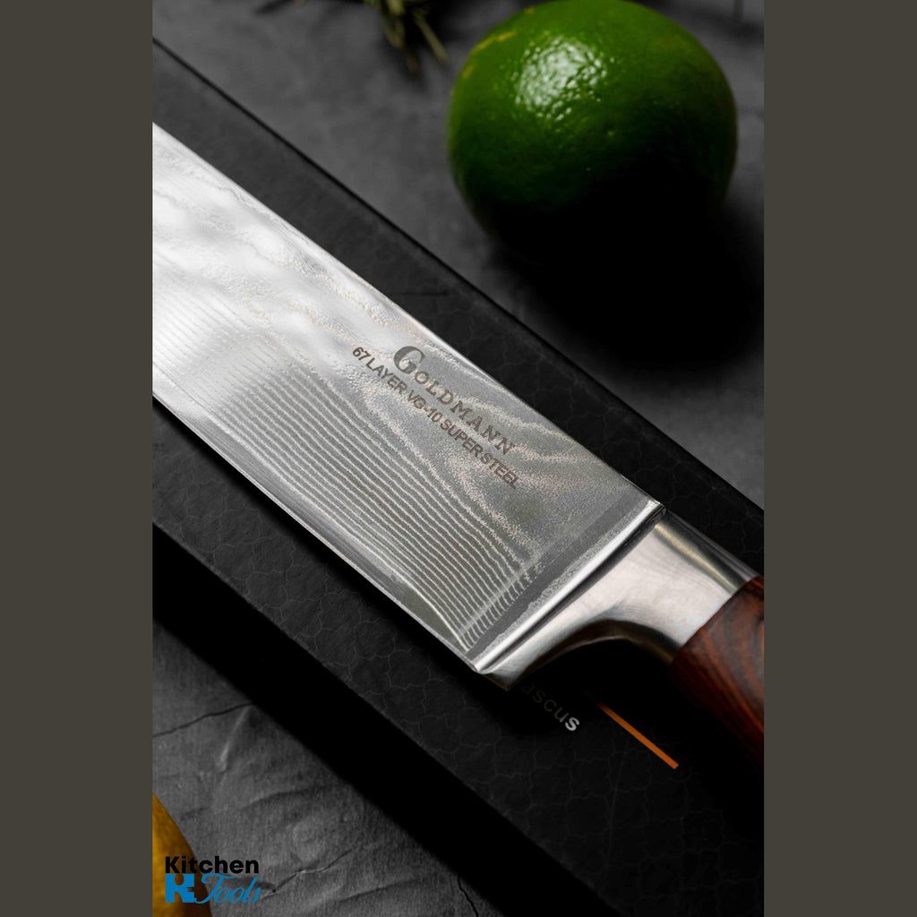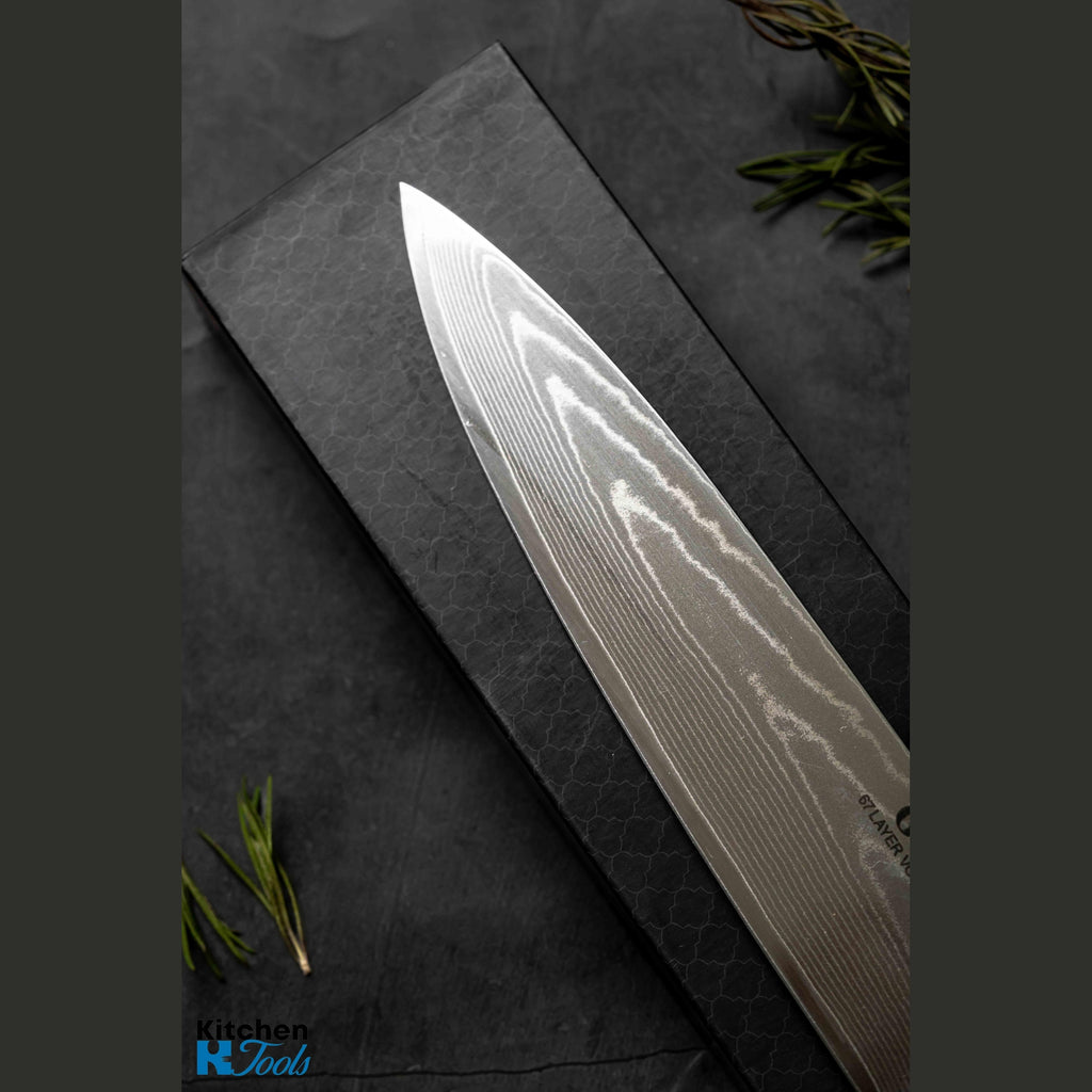 Fabricat din oțel Damasc cu 67 de straturi și un miez din VG-10/10Cr15CoMoV, cuțitul combină puterea și rafinamentul într-un echilibru perfect. Tăișul său extrem de ascuțit, cu o duritate Rockwell de 60 HRC, îți oferă precizia necesară pentru a sculpta, felia și curăța cu ușurință. Finisajul nu doar că îi conferă un design sofisticat, dar și îmbunătățește fluxul de aer pe lamă, prevenind lipirea alimentelor și asigurând o experiență impecabilă de tăiere.