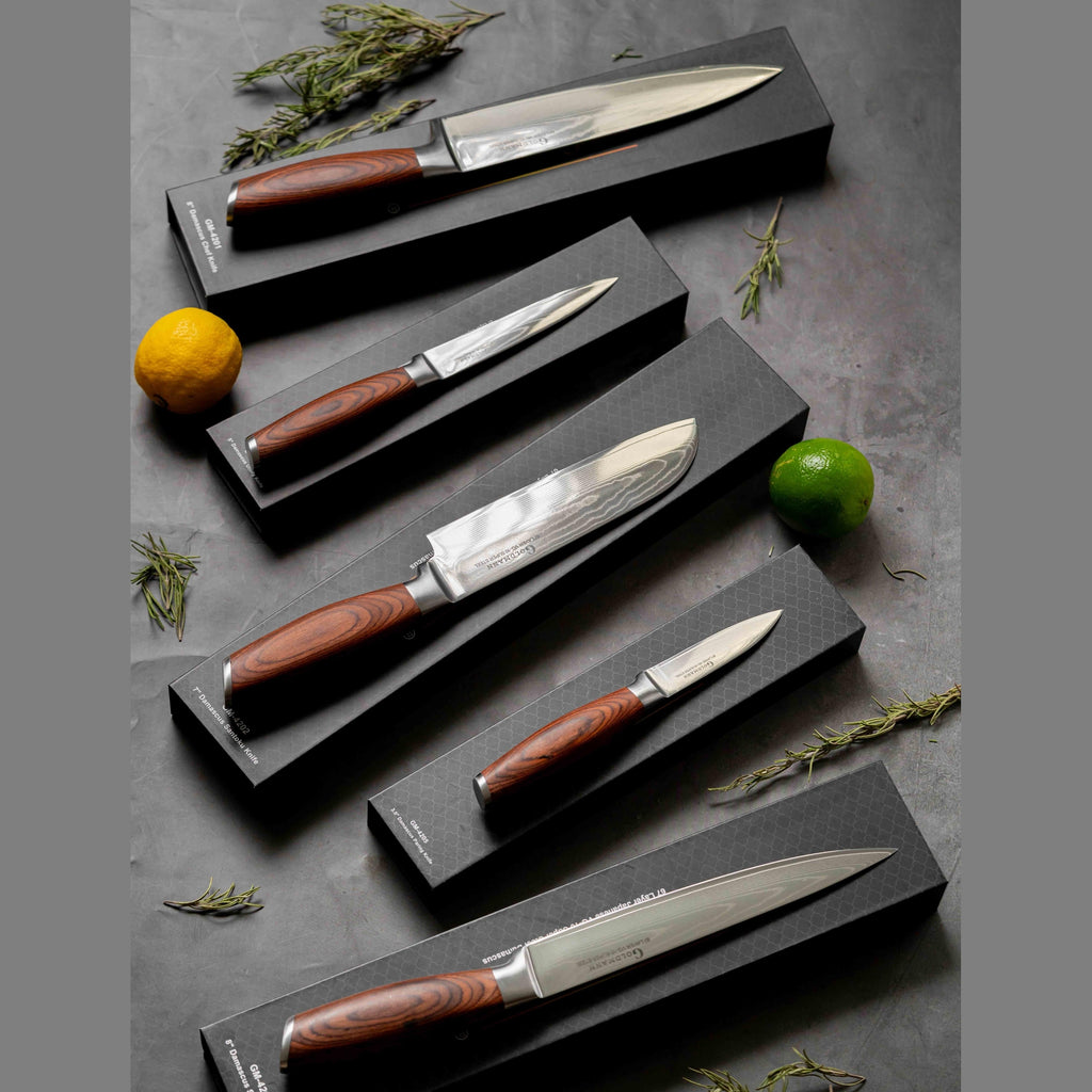 - Cuțit Utility 5" – lamă de 15 cm lungime și 2 cm lățime, versatil pentru sarcini diverse în bucătărie.