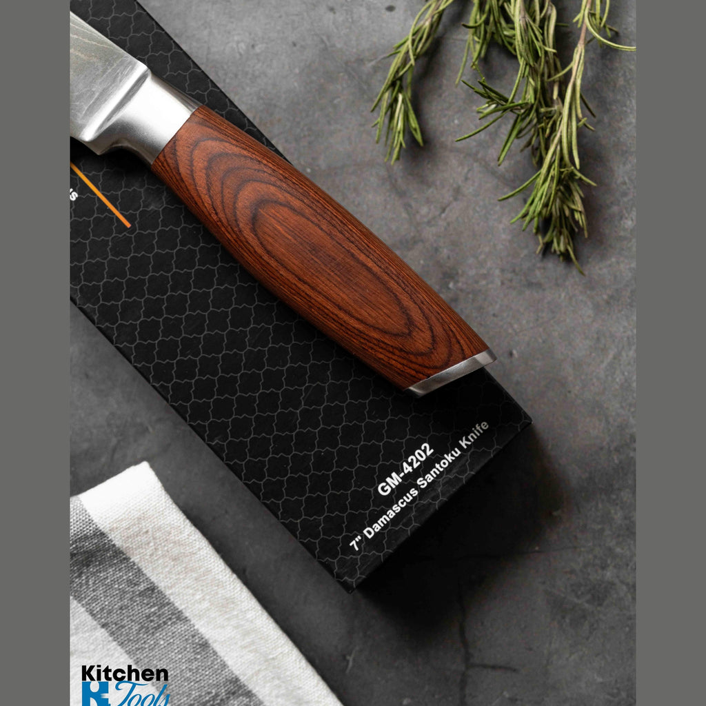 - Cuțit Santoku 7" – lamă de 17,8 cm lungime și 4,4 cm lățime, perfect pentru feliere, tocare și mărunțire.
