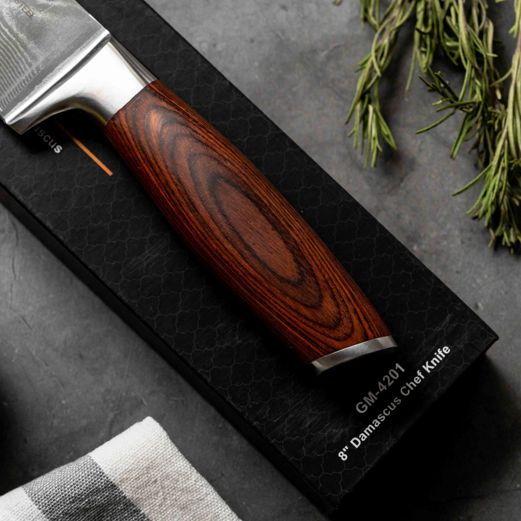 Mânerul premium din lemn de nuc, cu design Full Tang, se mulează perfect în palmă, oferind o prindere stabilă, confortabilă și sigură. Cu acest cuțit, fiecare mișcare devine naturală și fluidă, iar tu capeți încrederea unui adevărat maestru în bucătărie.