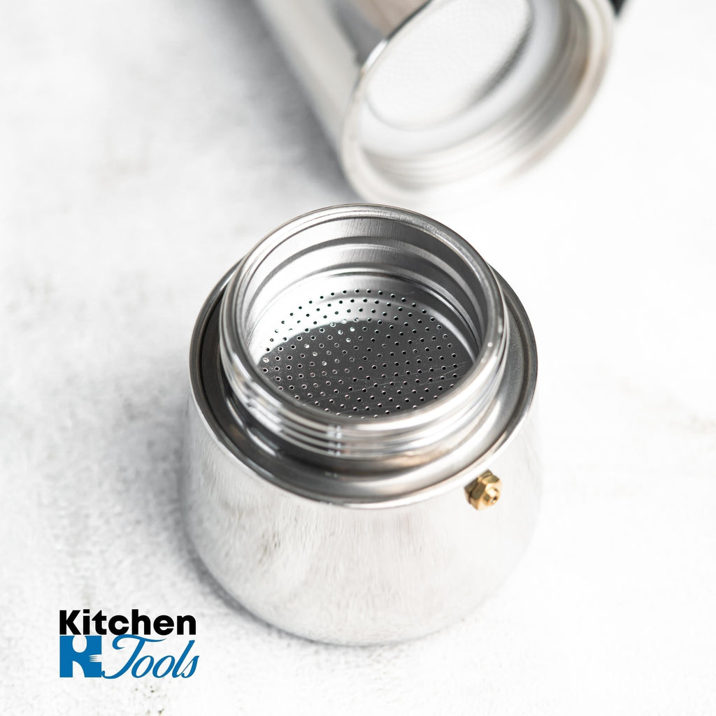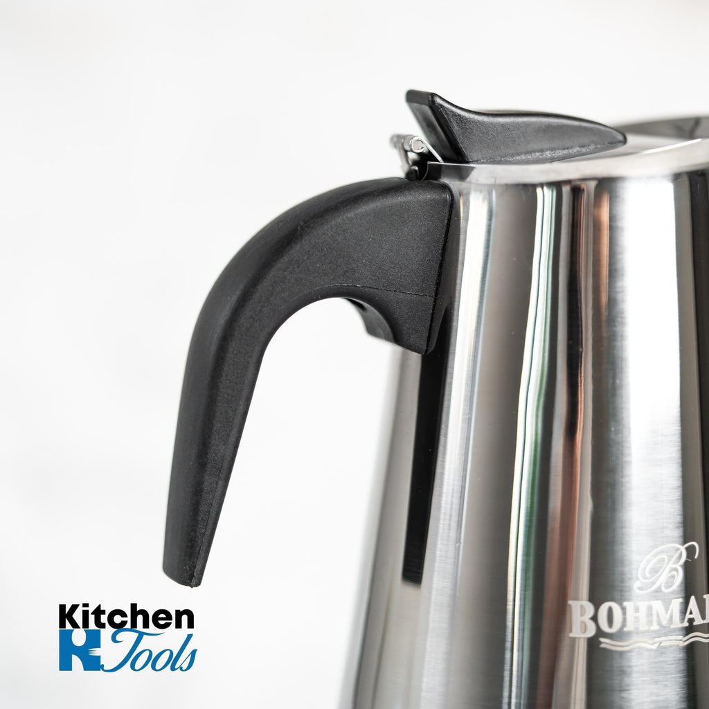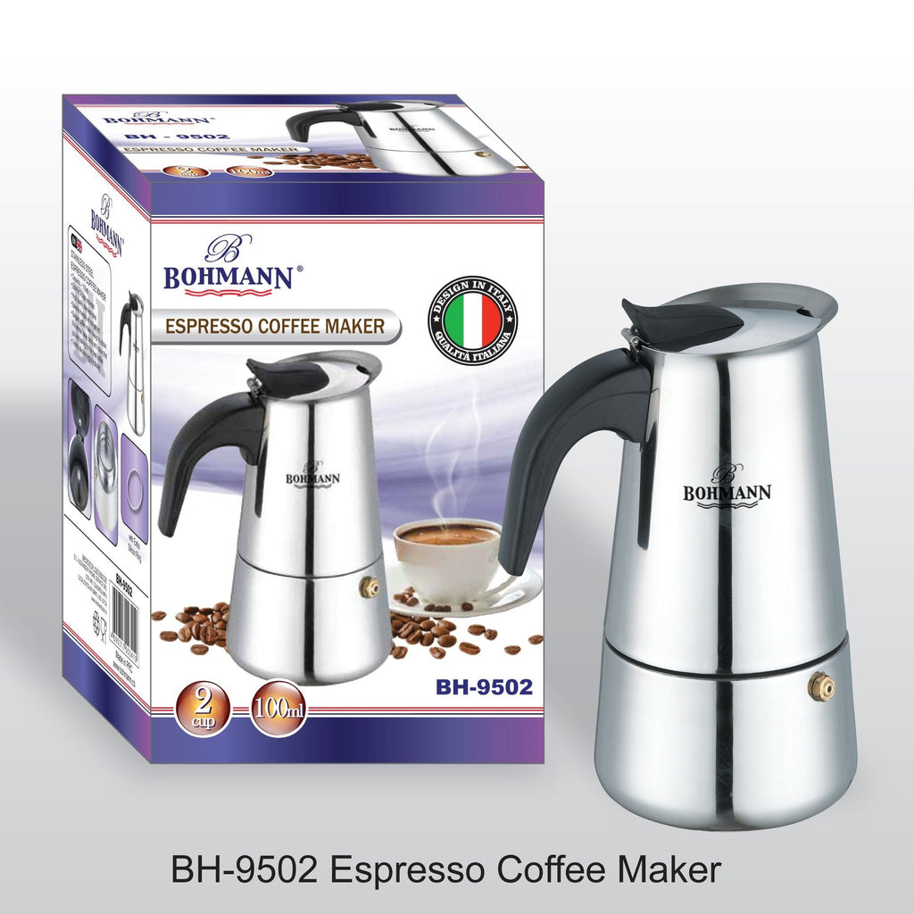 Espressor de cafea pentru aragaz Bohmann, argintiu, cu capacitate maximă de 2 cești. Corpul este fabricat din inox de înaltă calitate. Espressorul dispune de un mâner din bachelită termorezistentă, pentru mai multă siguranță. Designul clasic al espressorului de cafea asigură o utilizare și o curățare ușoară.
