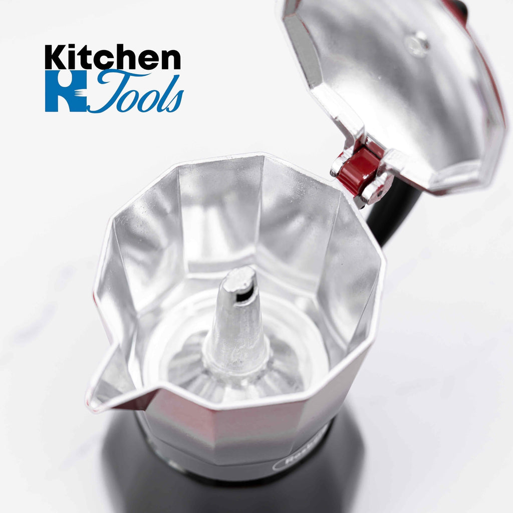 Espressor de cafea pentru aragaz Zephyr, roșu-negru, cu capacitate maximă de 6 cești. Corpul este fabricat din aluminiu de înaltă calitate și dispune de mâner din bachelită termorezistent pentru mai multă siguranță. Designul clasic al espressorului de cafea asigură o utilizare și o curățare ușoară.