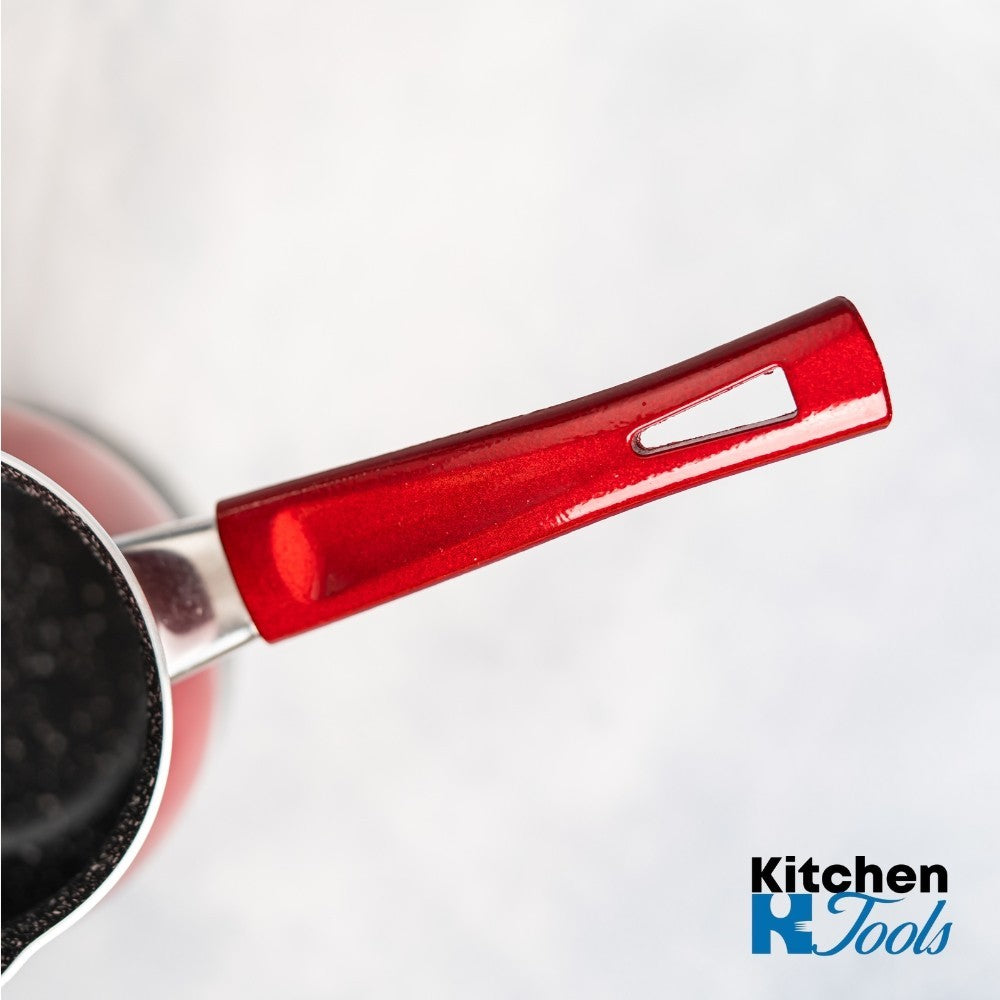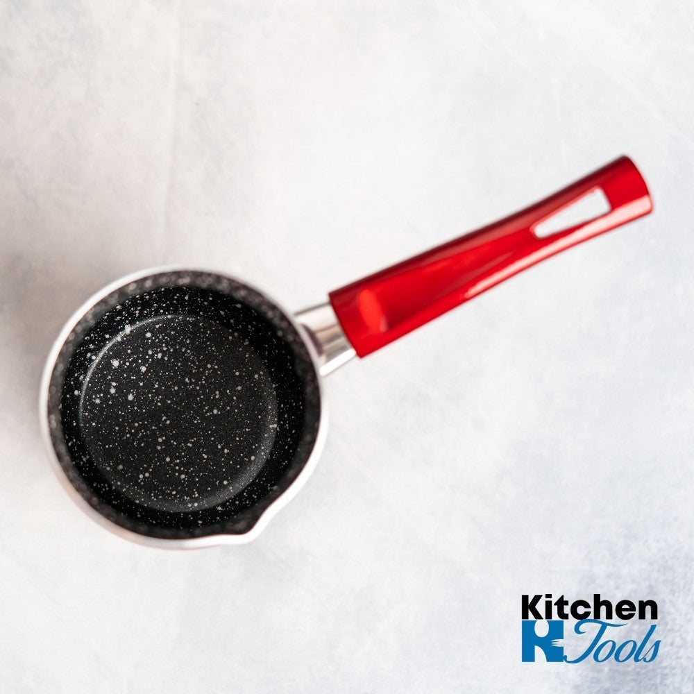 Volumul de 1320 ml îl face comparabil cu o cratiță mică, fiind perfect pentru a încălzi rapid laptele pentru mai multe persoane. Corpul din aluminiu asigură o încălzire rapidă și uniformă. Interiorul acoperit cu un strat marmorat (granit) de înaltă performanță este crucial, deoarece previne lipirea și arderea preparatelor delicate precum cremele, laptele sau cafeaua, simplificând la maximum curățarea.