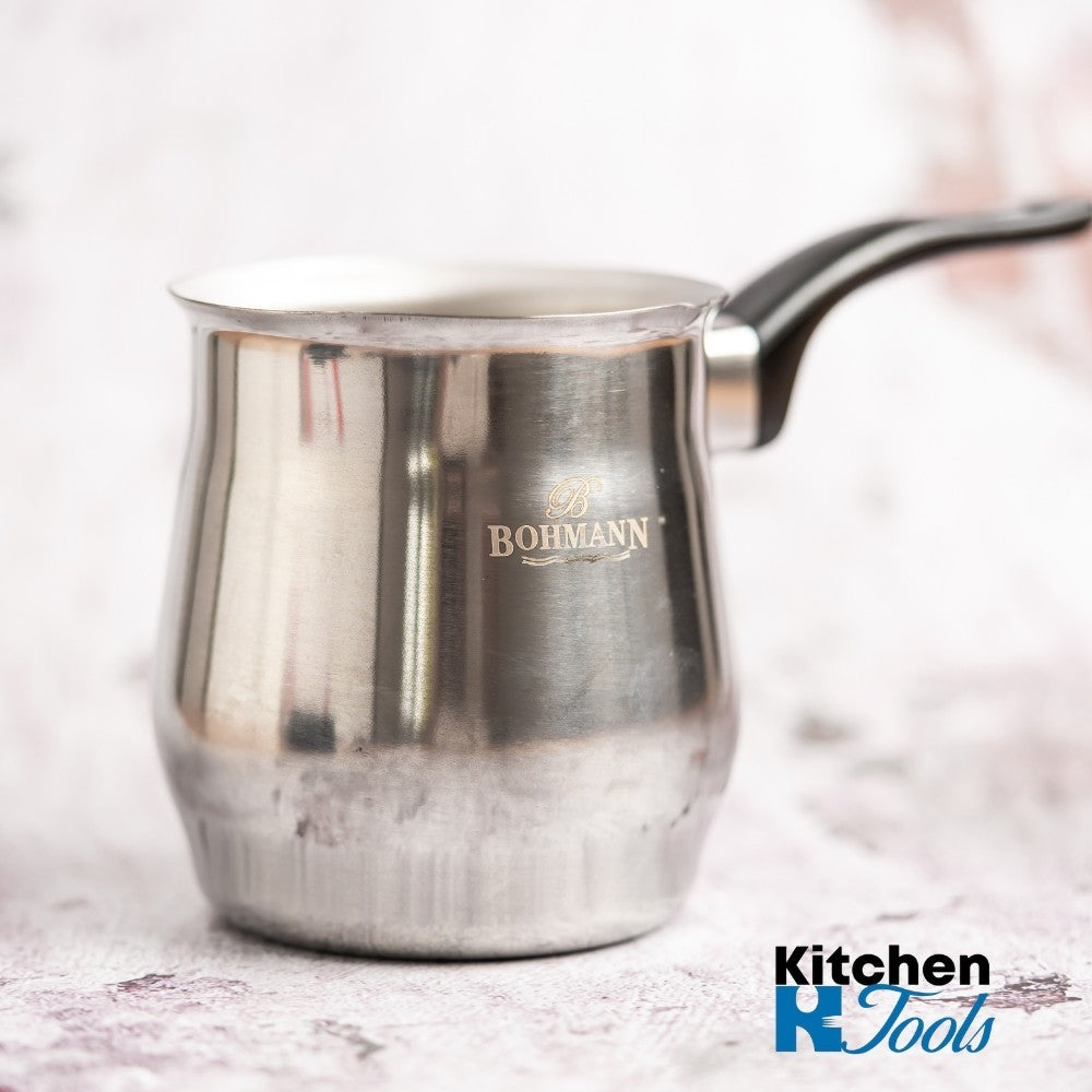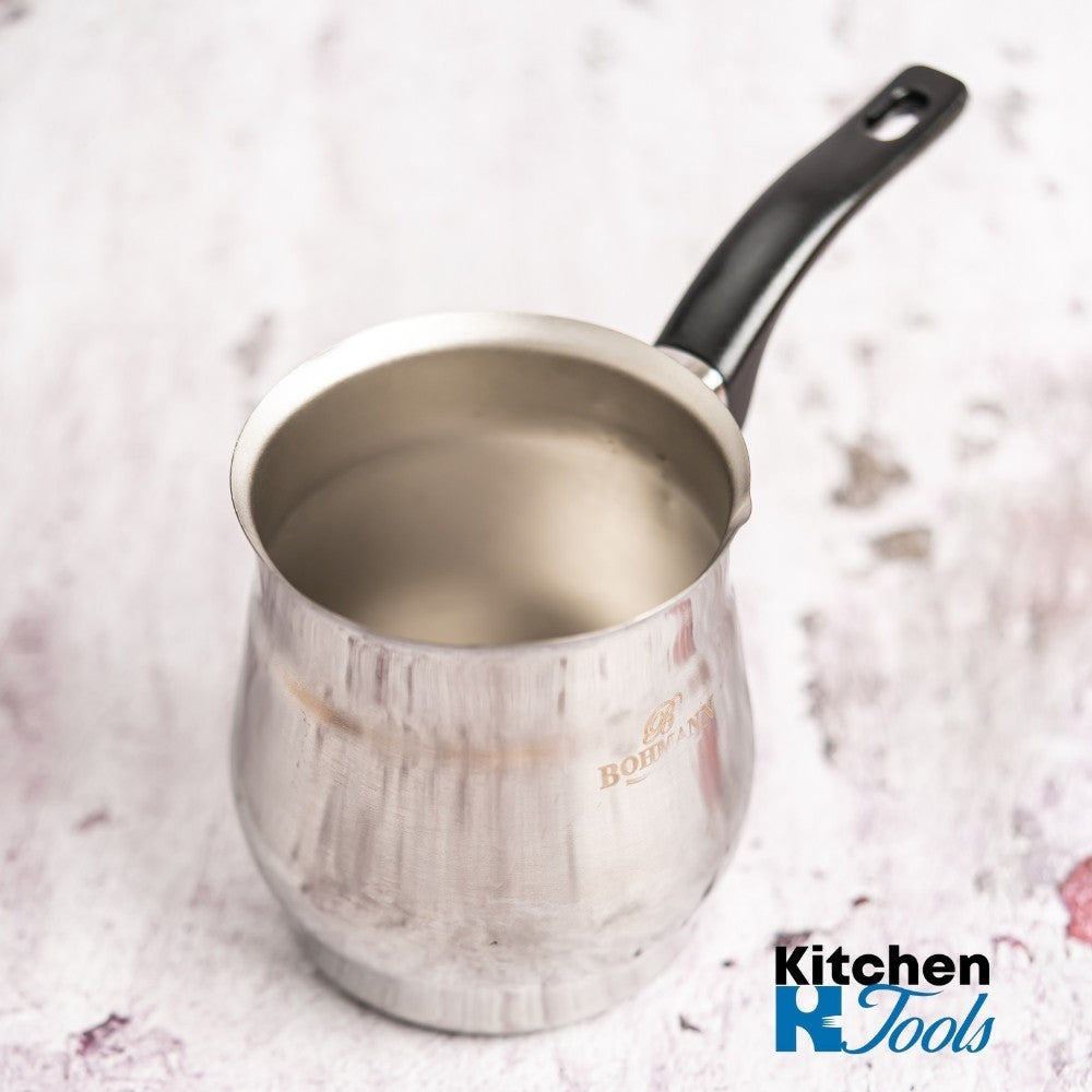 Ibric din inox, capacitate 645 ml, cu mâner din bachelită termorezistentă.