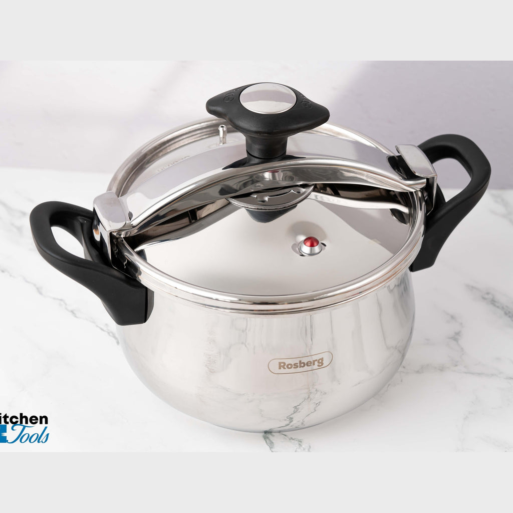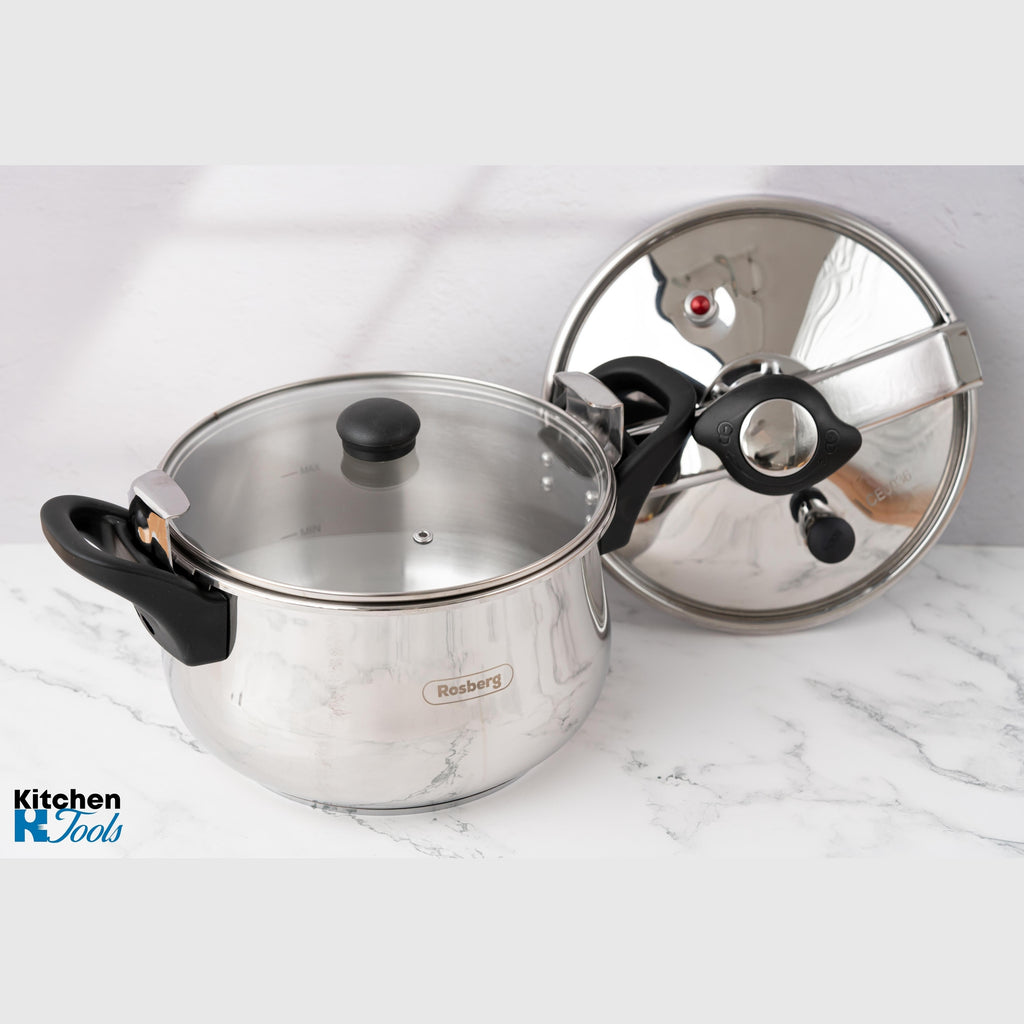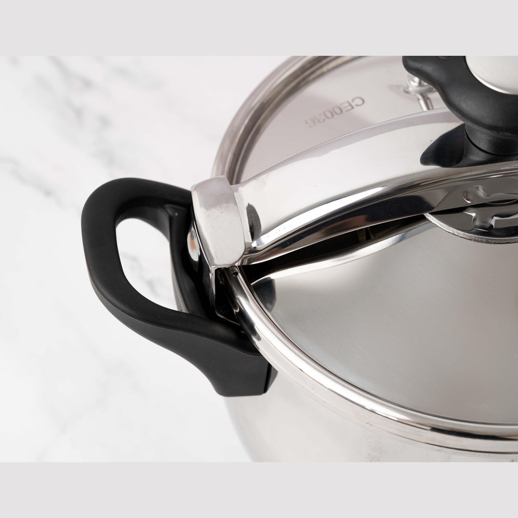 Mecanismul ferm de inchidere va asigura un gatit fara griji, reducand totodata timpul de pregatire a mancarurilor si oferind o economisire de energie. Pastreaza valorile nutritive si minerale din alimente. Manerele sunt nituite si parte integranta din produs.. Indiferent daca esti sau nu un bucatar profesionist, oala sub presiune, te va ajuta sa pregatesti mancaruri extraodinare, fara prea mult efort. Incalzeste rapid si mentine eficient temperatura datorita, datorita bazei in 5 straturi, scade considerabil timpul de fierbere. Capacul dispune de doua supape, una fiind pentru siguranta.