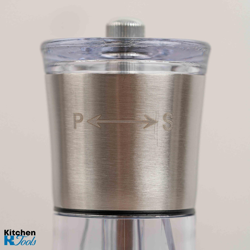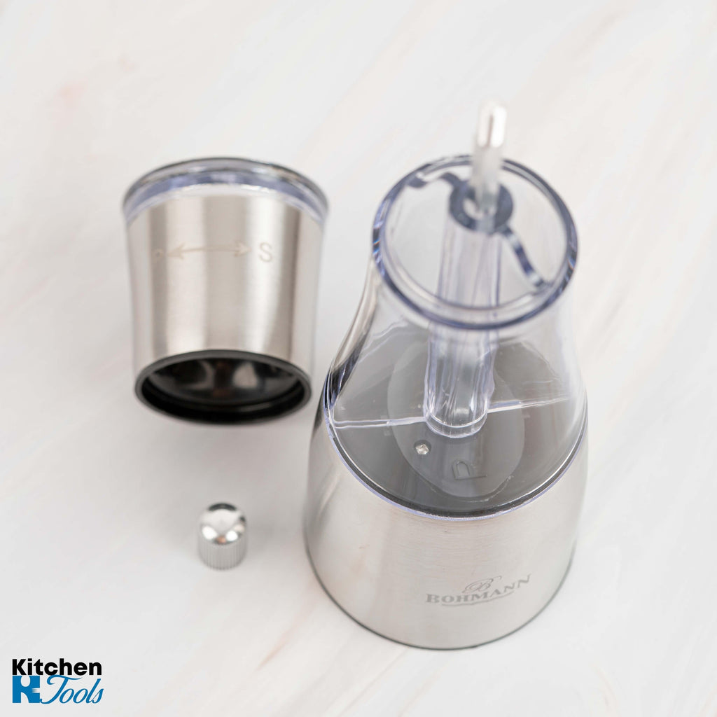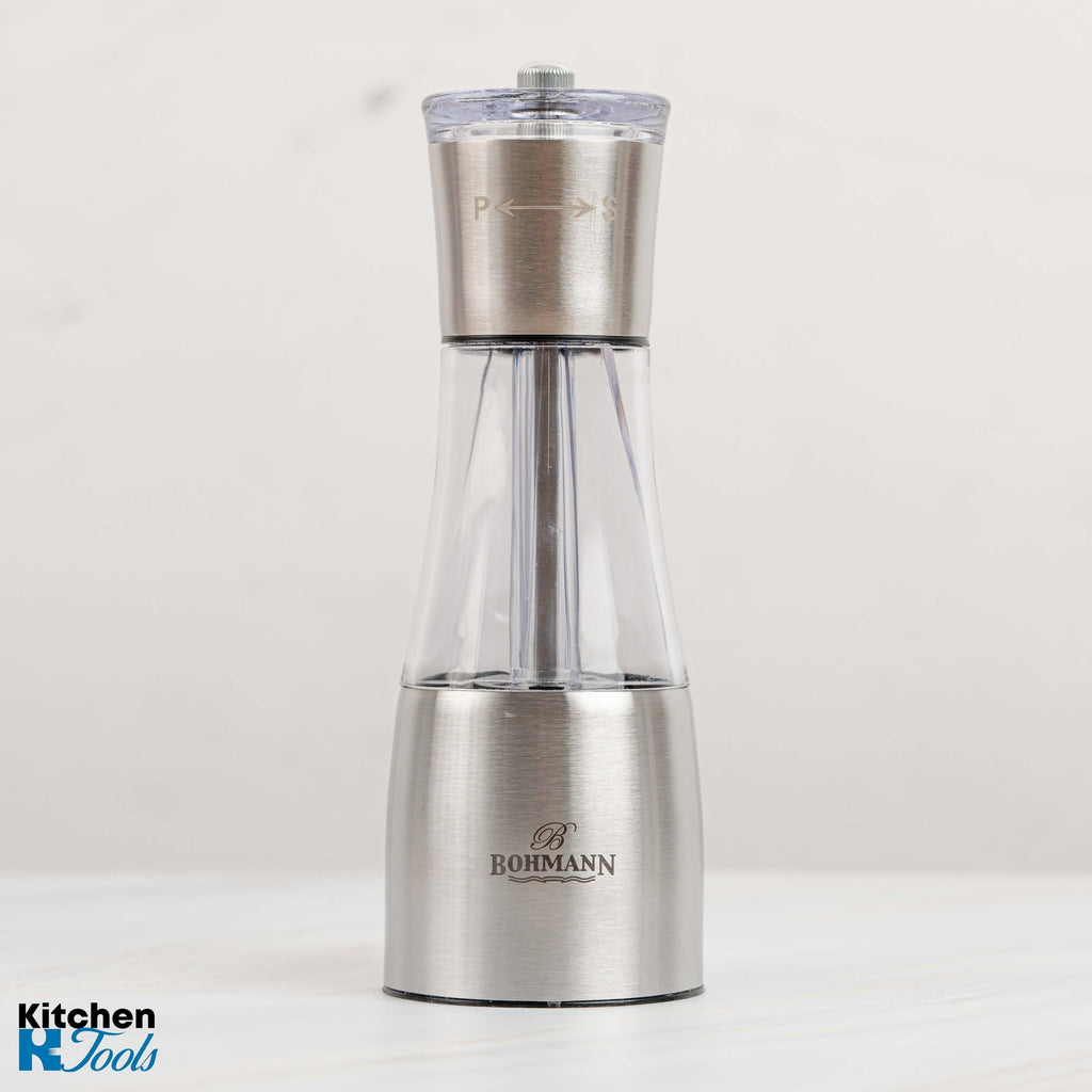 Set condimente 2 în 1 Bohmann BH-7801, cu 2 compartimente. Râșniță pentru piper și sare, carcasă din oțel inoxidabil, cap de măcinare din ceramică de înaltă calitate, cu două compartimente pentru boabe de piper și cristale de sare.