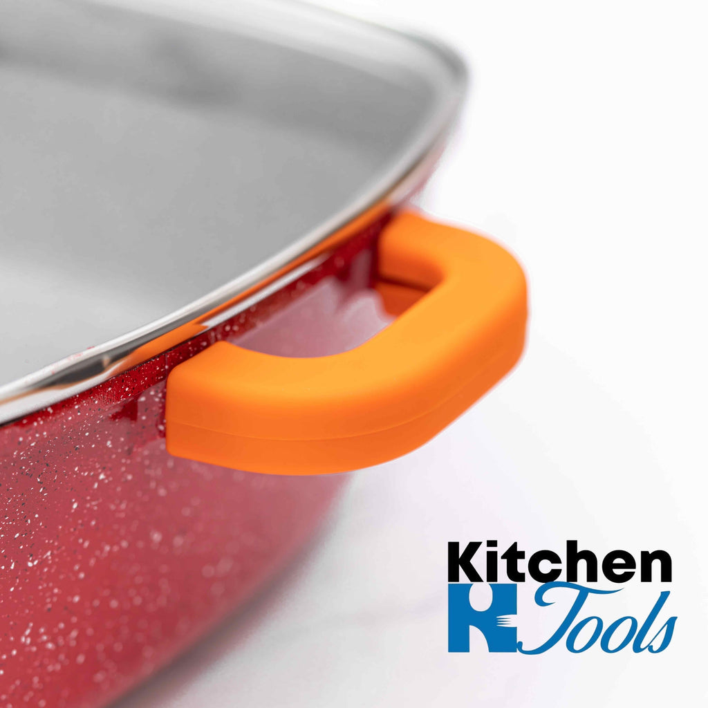 - Mânere din aliaj, cu set de capace din silicon pentru protecție împotriva arsurilor