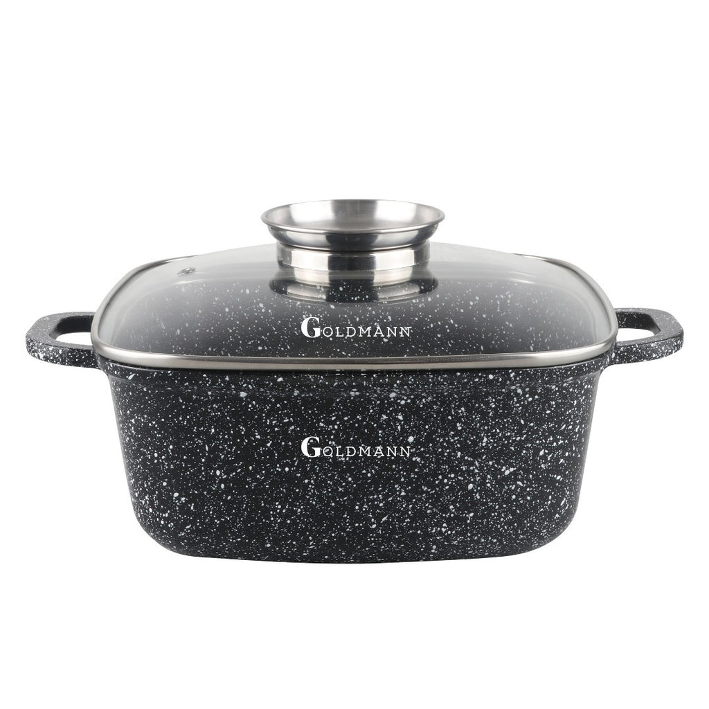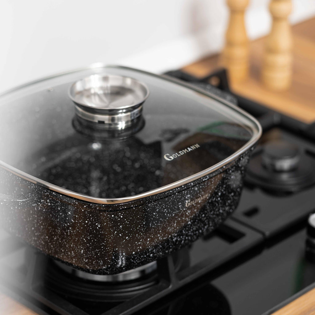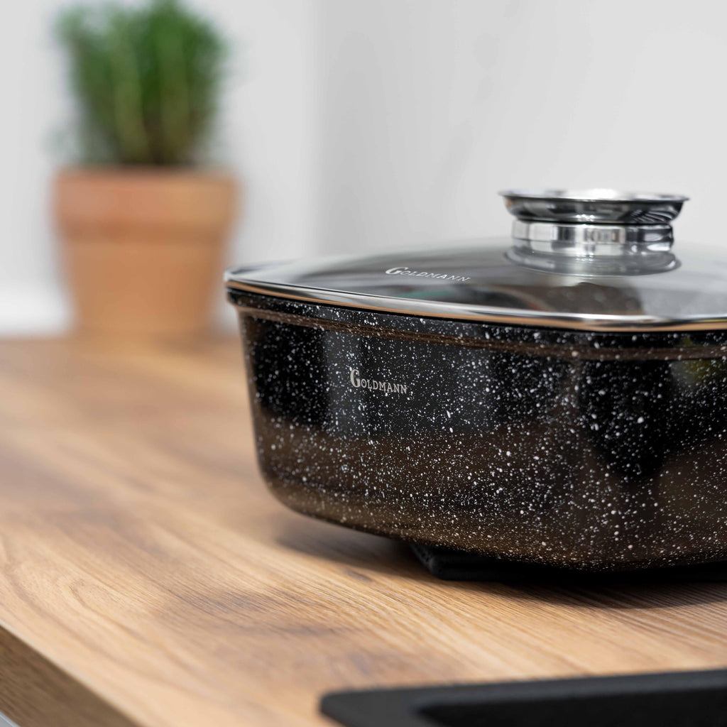 - Acoperire ceramică marmorată: Suprafața interioară a cratiței este acoperită cu un strat ceramic marmorat, oferind o rezistență crescută la lipire și facilitând gătitul fără grăsimi.
