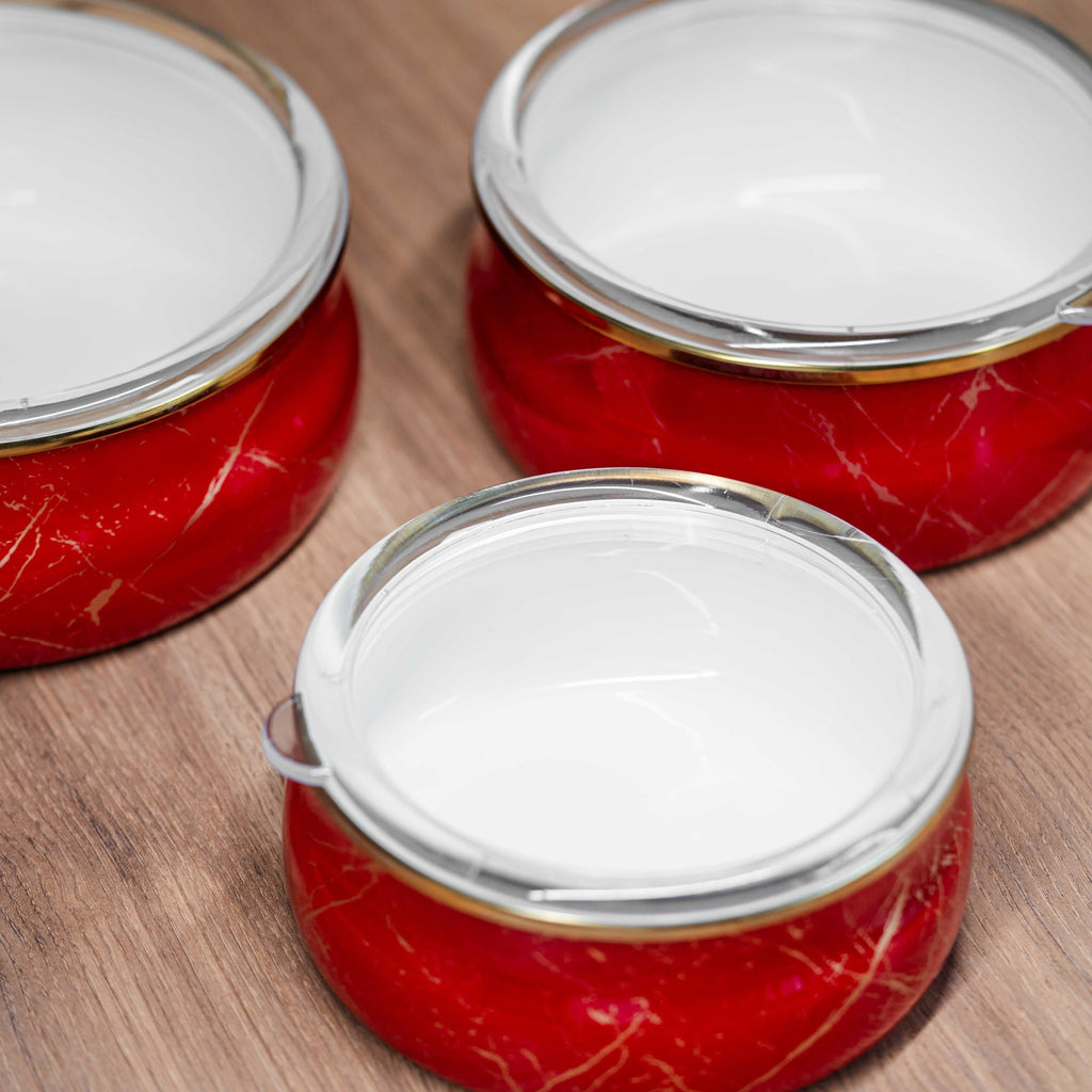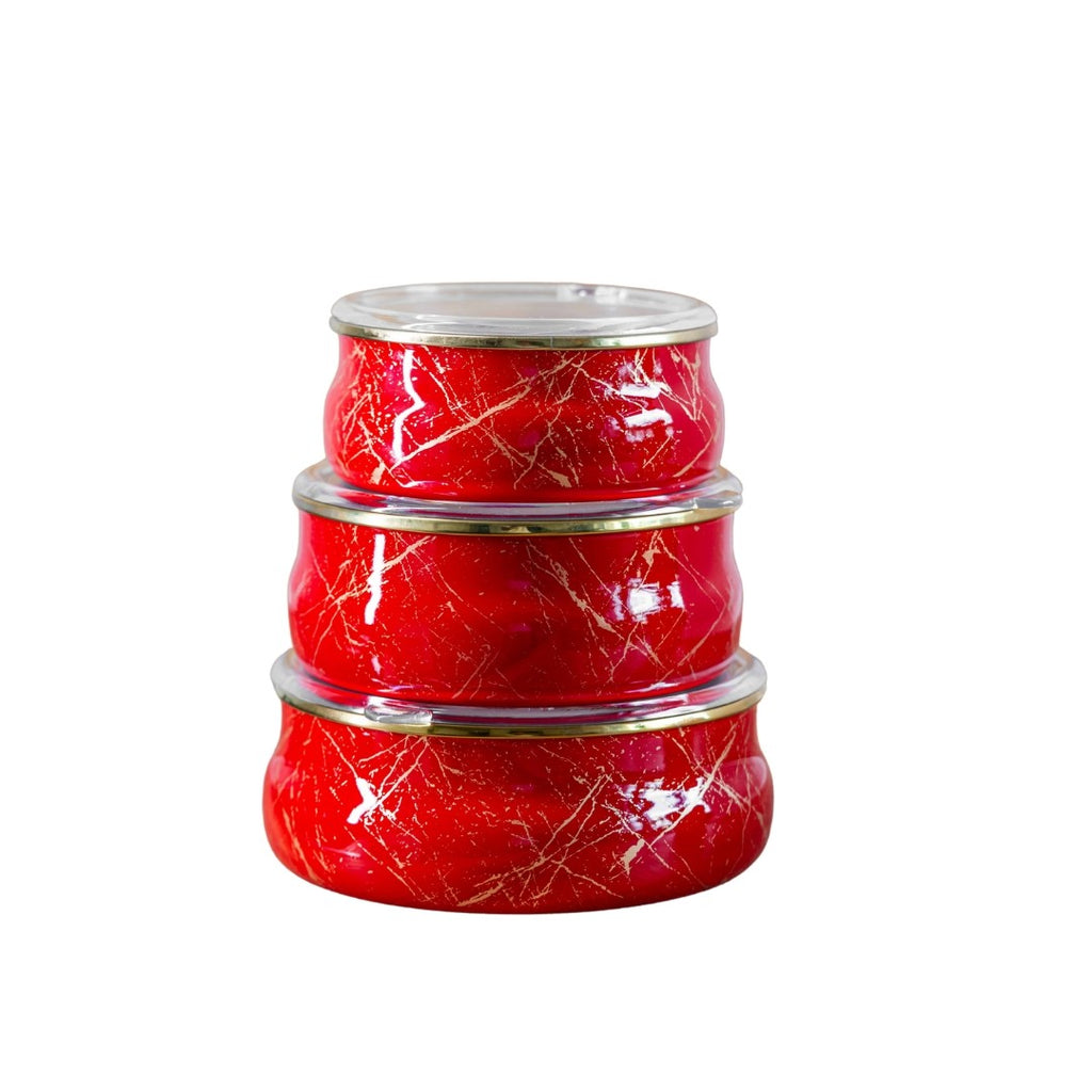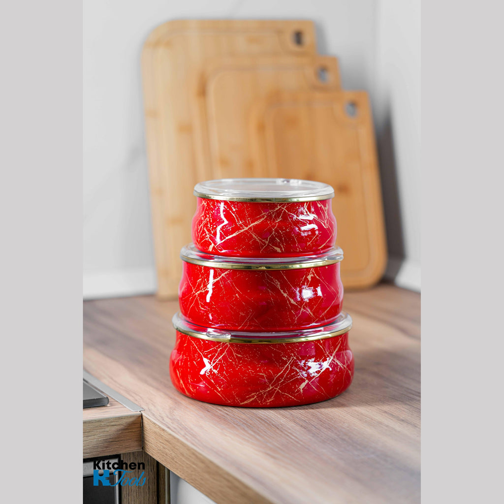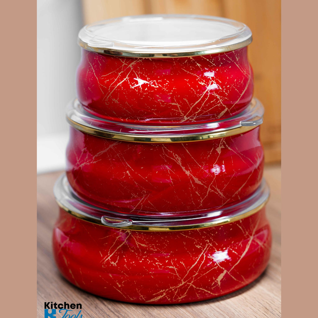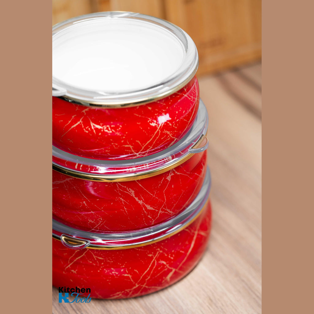 Set de 3 boluri emailate cu capace, realizate din oțel carbon laminat la rece, acoperite cu două straturi de email durabil. Aceste boluri sunt ideale atât pentru gătit, cât și pentru depozitarea alimentelor.