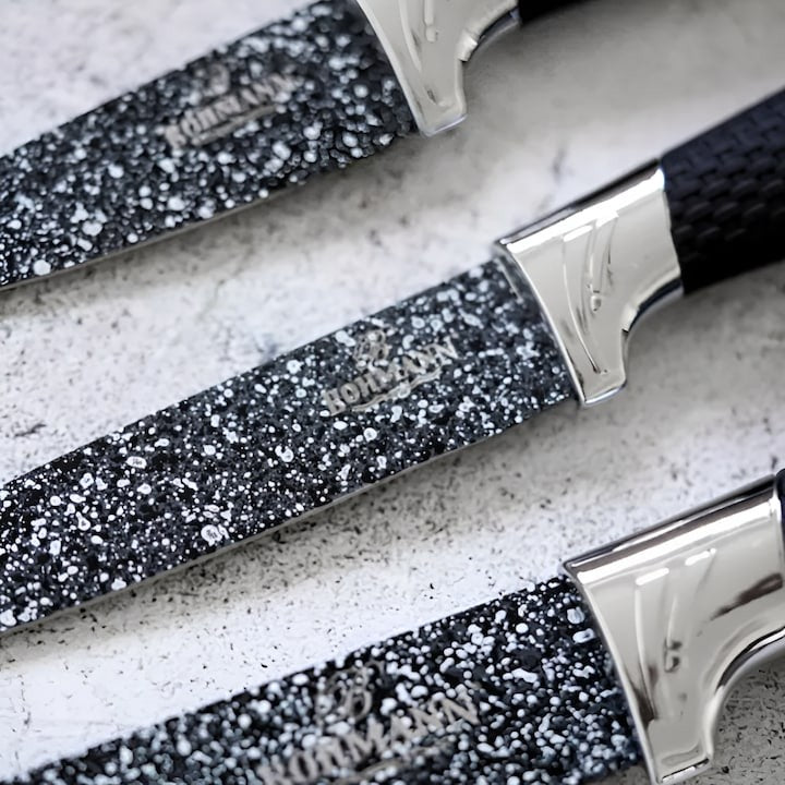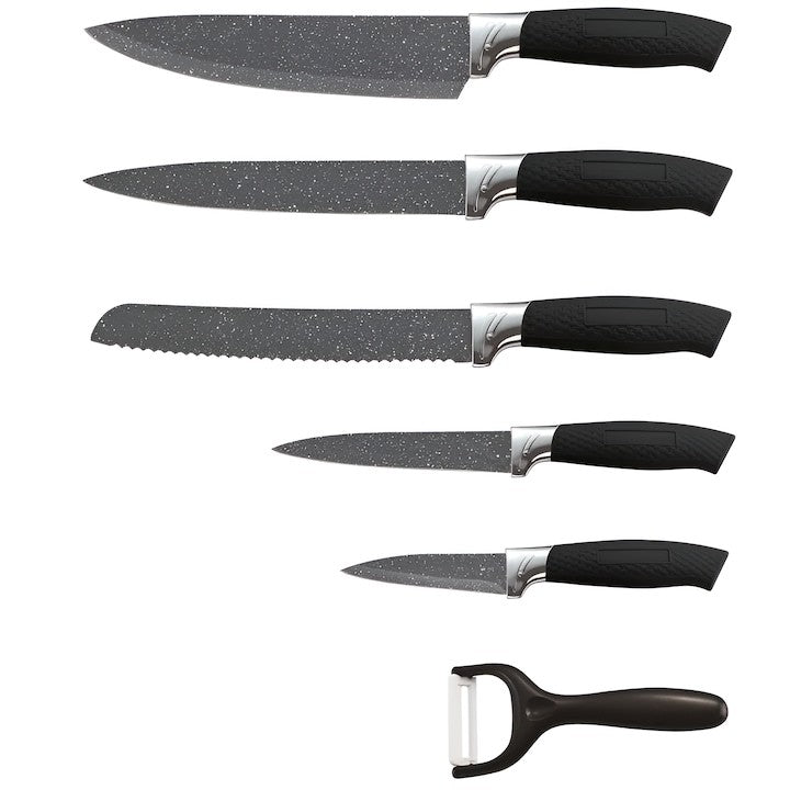 Setul include cinci cuțite de dimensiuni diferite, acoperind o gamă largă de nevoi culinare, de la tăierea legumelor delicate până la porționarea cărnii. De asemenea, setul include un aparat de decojit, util pentru pregătirea rapidă a fructelor și legumelor.