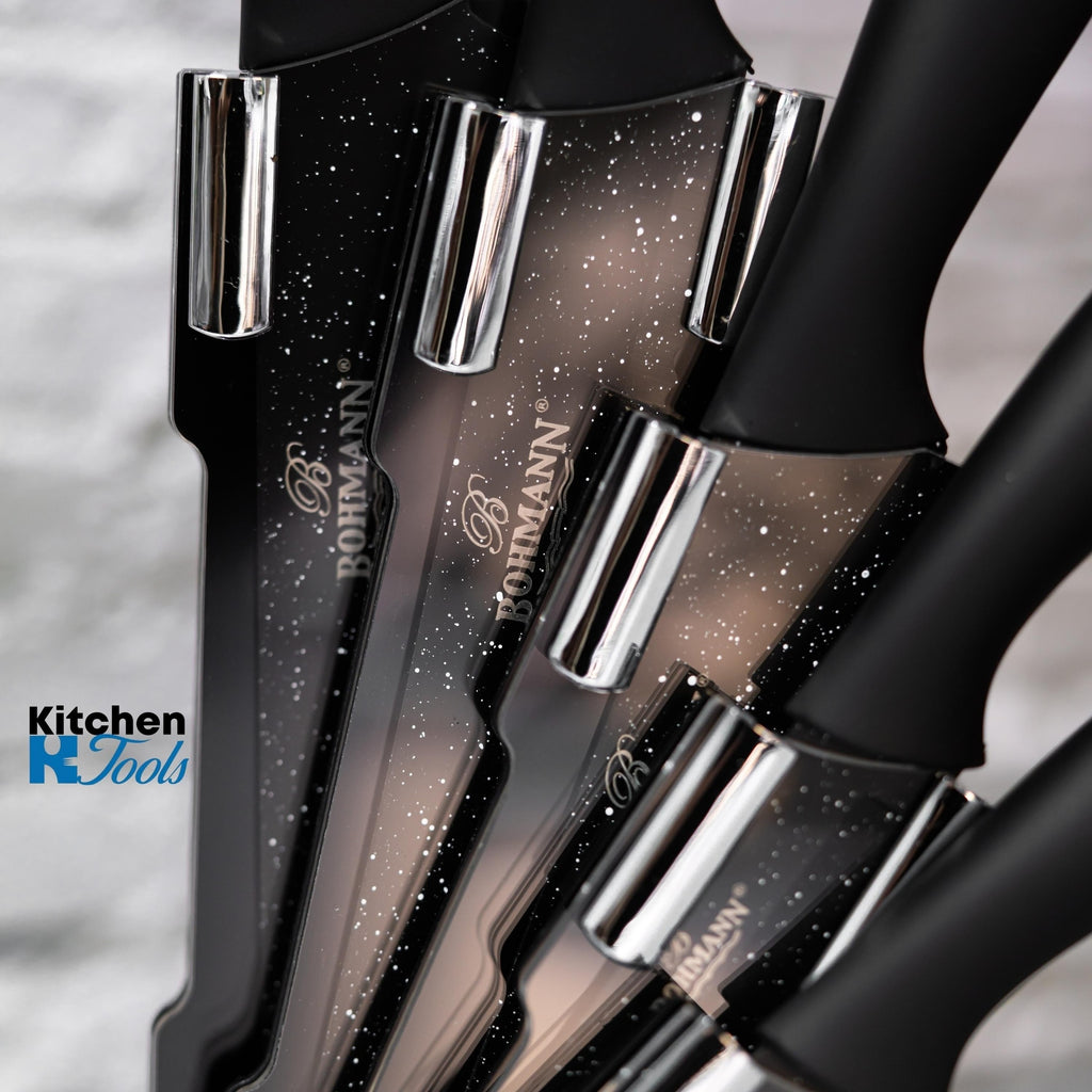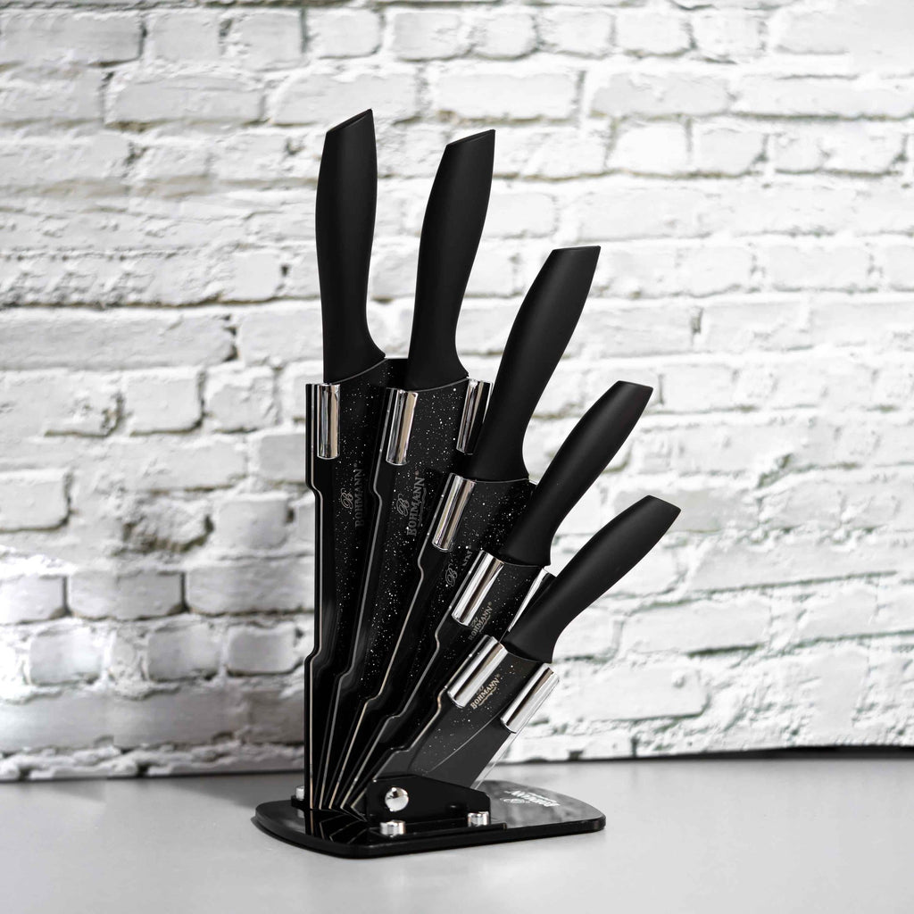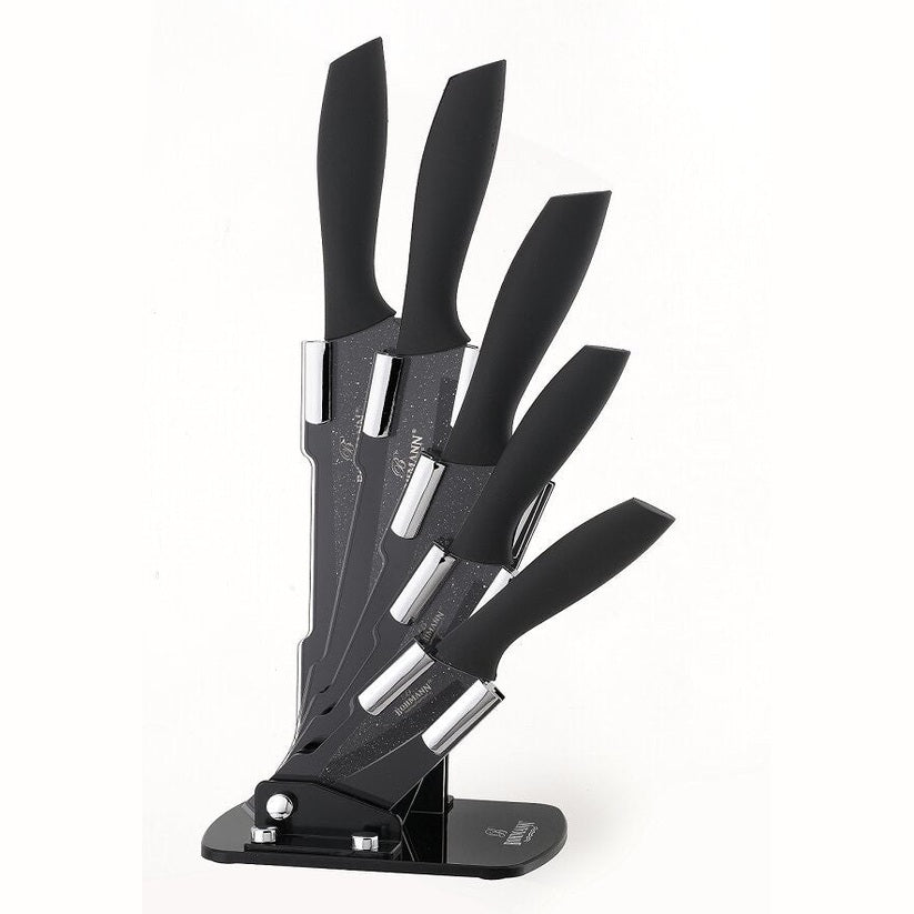 Set de 5 cuțite Bohmann cu suport acrilic, lame din oțel inoxidabil cu înveliș marmorat și mânere negre soft-touch.