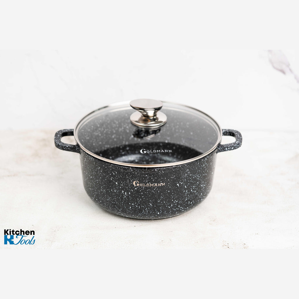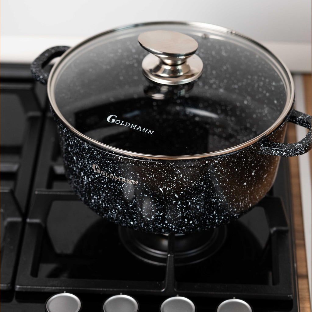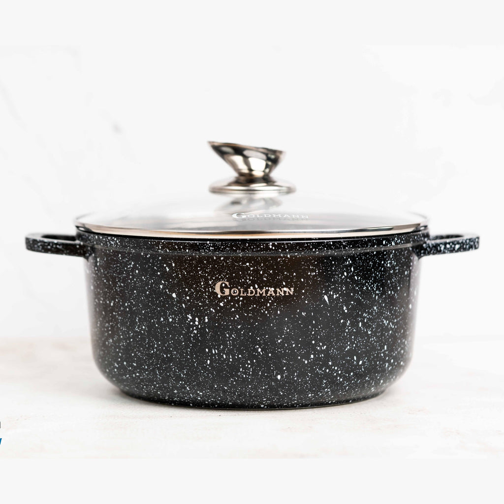 Bucură-te de o experiență culinară superioară cu setul de 3 oale Goldmann, concepute pentru a-ți ușura munca în bucătărie și a garanta preparate delicioase, gătite uniform. Fabricate din aluminiu rezistent la coroziune și acoperite cu un strat inovator de granit antiaderent, aceste oale îți oferă performanță ridicată și durabilitate pe termen lung.