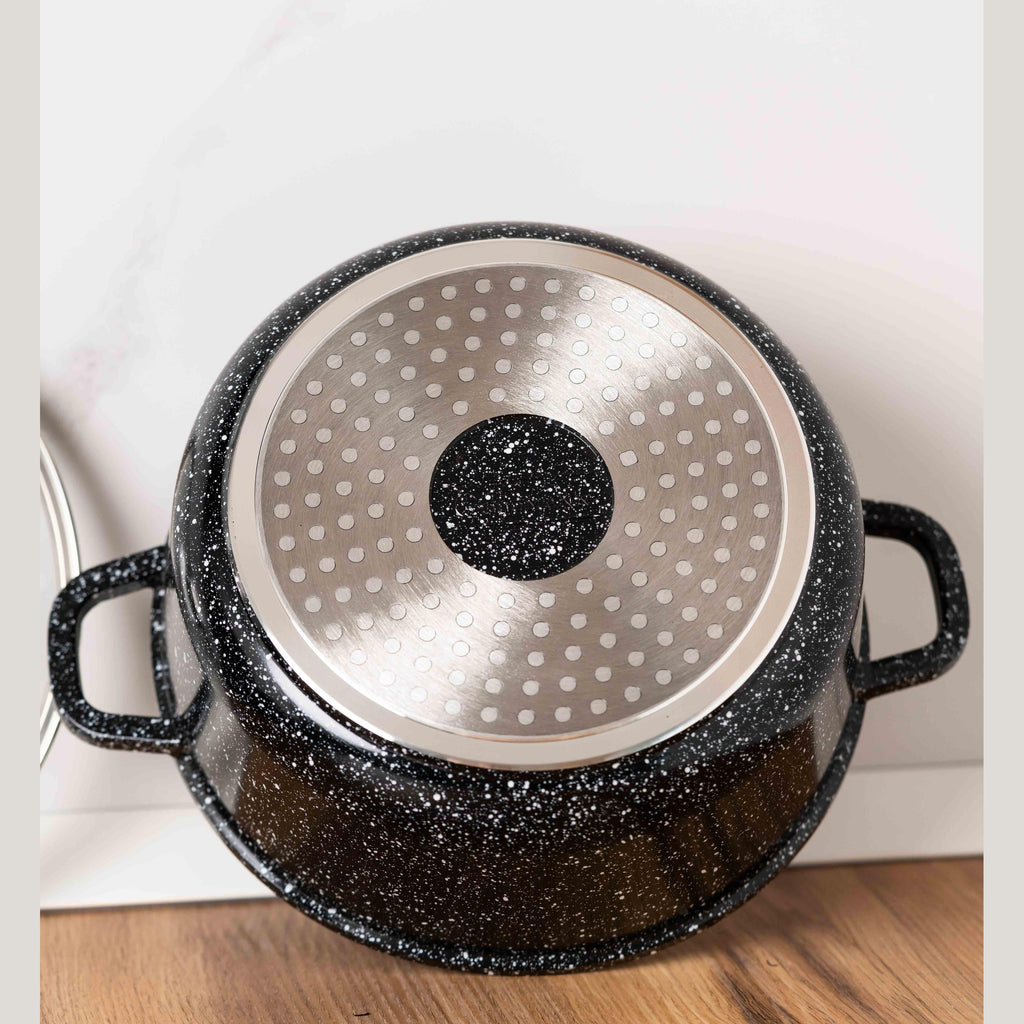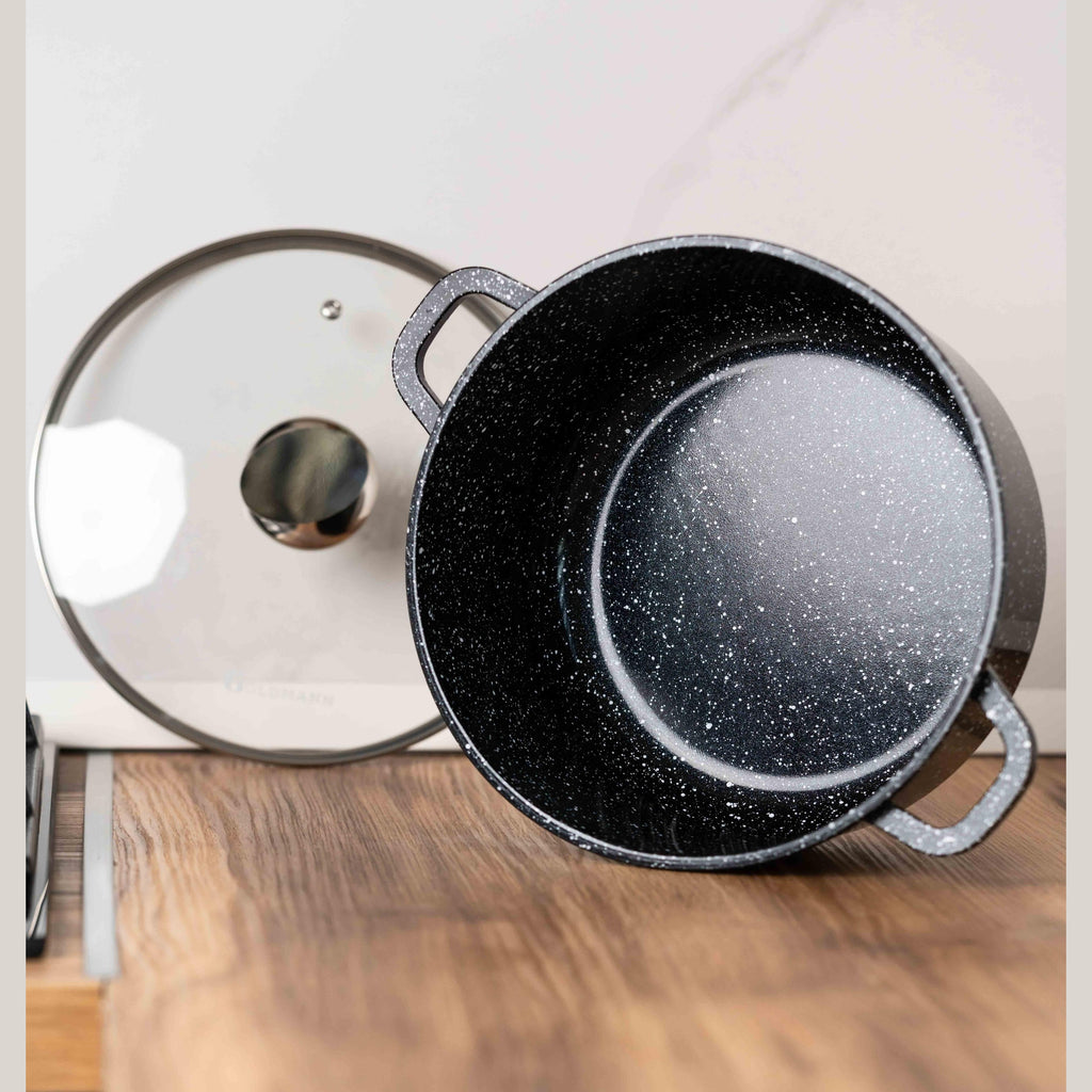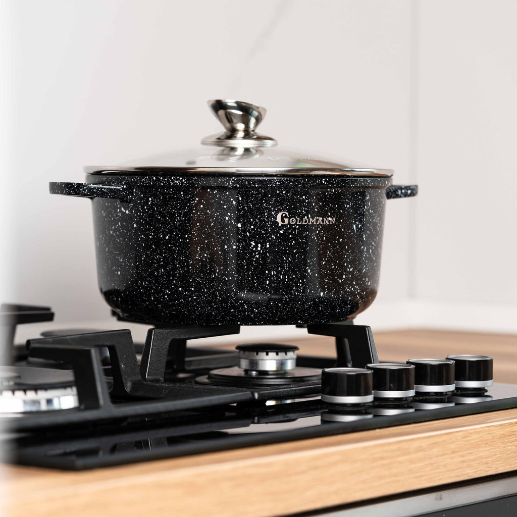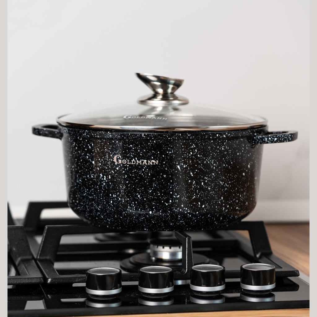 Bucură-te de o experiență culinară superioară cu setul de 3 oale Goldmann, concepute pentru a-ți ușura munca în bucătărie și a garanta preparate delicioase, gătite uniform. Fabricate din aluminiu rezistent la coroziune și acoperite cu un strat inovator de granit antiaderent, aceste oale îți oferă performanță ridicată și durabilitate pe termen lung.