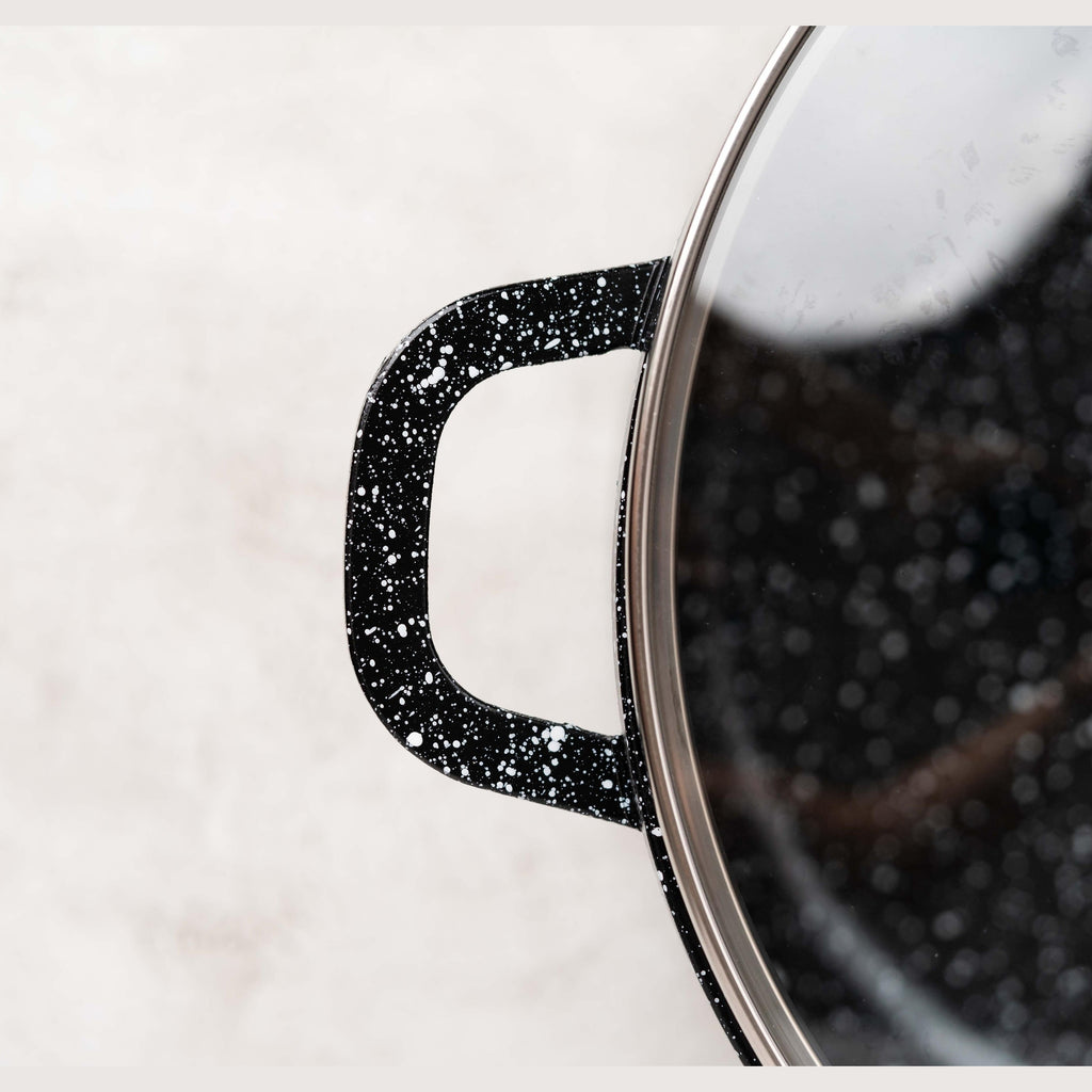 - Strat antiaderent din granit – gătitul devine mai simplu și mai sănătos, deoarece nu este nevoie de exces de ulei sau grăsimi. Preparatele nu se lipesc, iar curățarea este extrem de ușoară. În plus, stratul de granit nu interacționează chimic cu alimentele, păstrând gustul, culoarea și proprietățile nutritive ale ingredientelor.