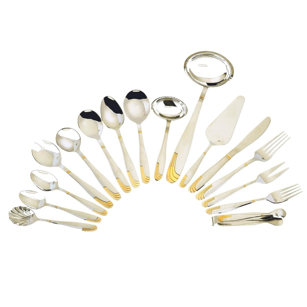 | Conținut set | 12 x furculițe de masă, 12 x cuțite de masă, 12 x linguri de masă, 12 x lingurițe pentru ceai, 12 x furculițe pentru desert, 12 x lingurițe pentru cafea, 2 x furculițe pentru carne, 2 x linguri de servire, 1 x linguriță pentru zahăr, 1 x lingură pentru sos, 1 x lingură pentru salată, 1 x furculiță pentru salată, 1 x polonic, 1 x paletă pentru tort, 1 x clește pentru zahăr. |