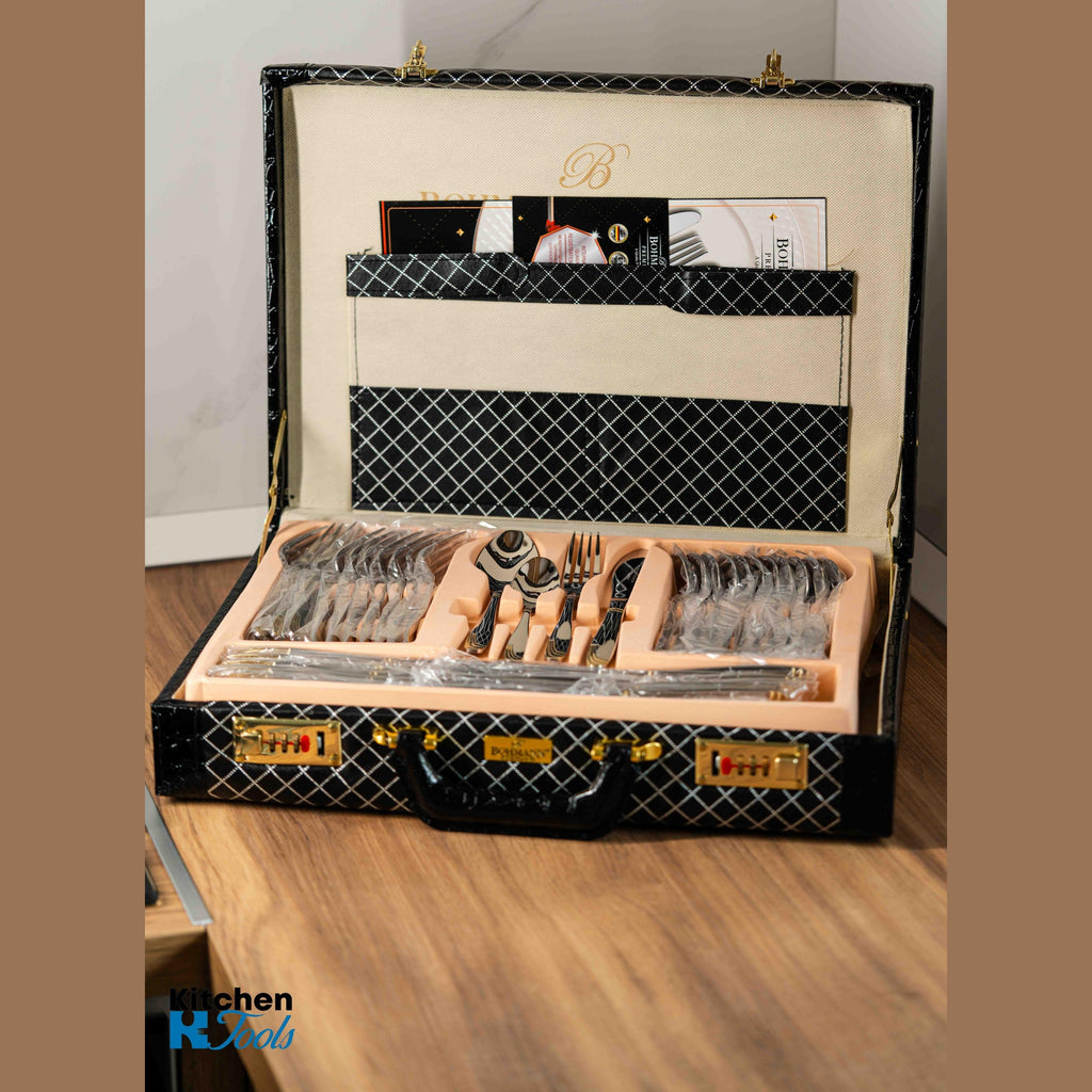 Transformă fiecare masă într-o experiență de lux! Cu setul de tacâmuri Bohmann, rafinamentul și calitatea excepțională își găsesc locul în bucătăria ta. Un set complet de 72 de piese, inclusiv cuțite, perfect echilibrat între design elegant și rezistență de neegalat.