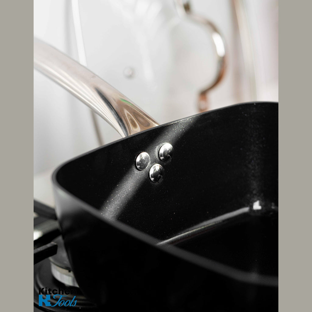 Mânerele din oțel inoxidabil sunt concepute ergonomic, oferind un control excelent și o prindere sigură. Fixate cu nituri rezistente, rămân stabile chiar și în cele mai solicitante situații de gătit.