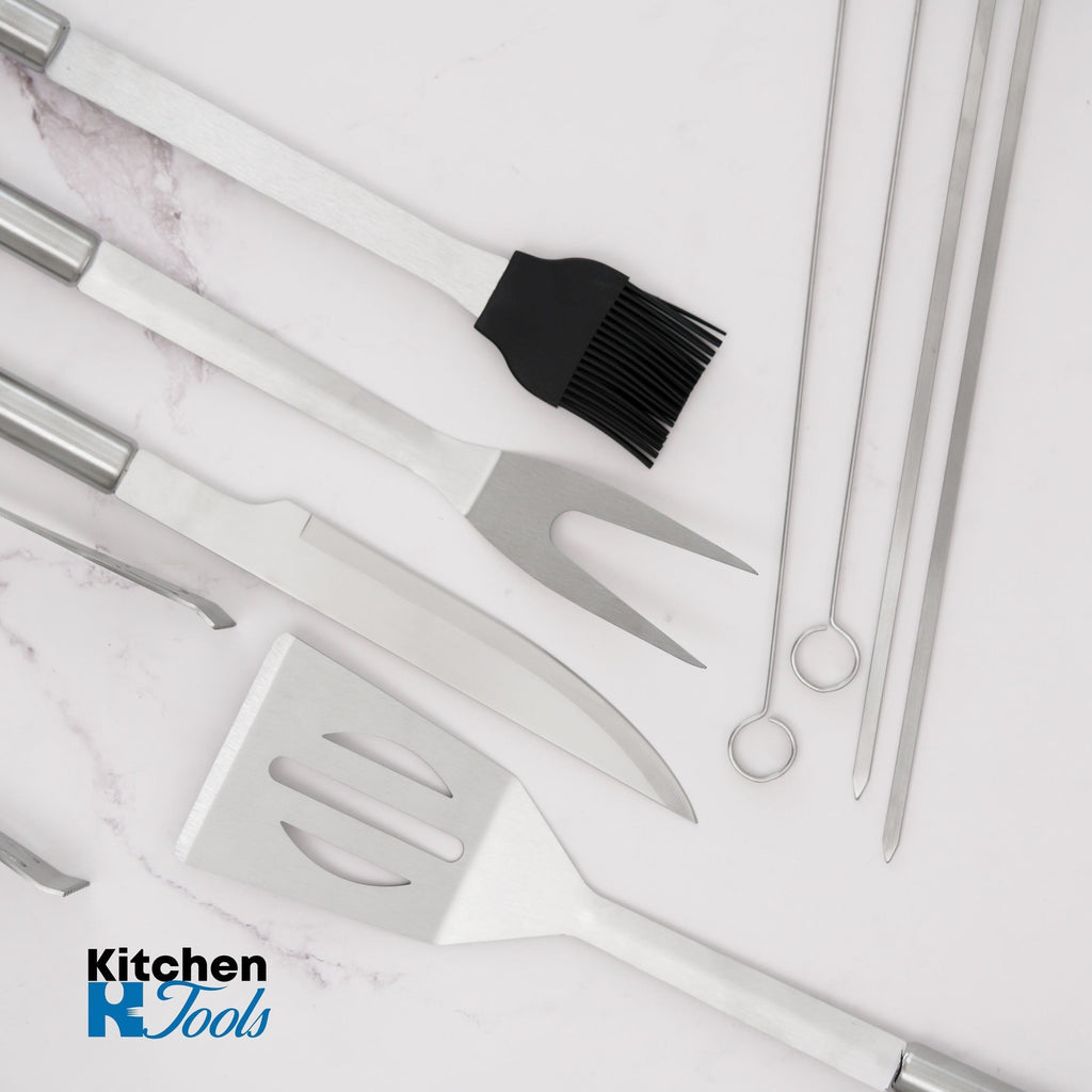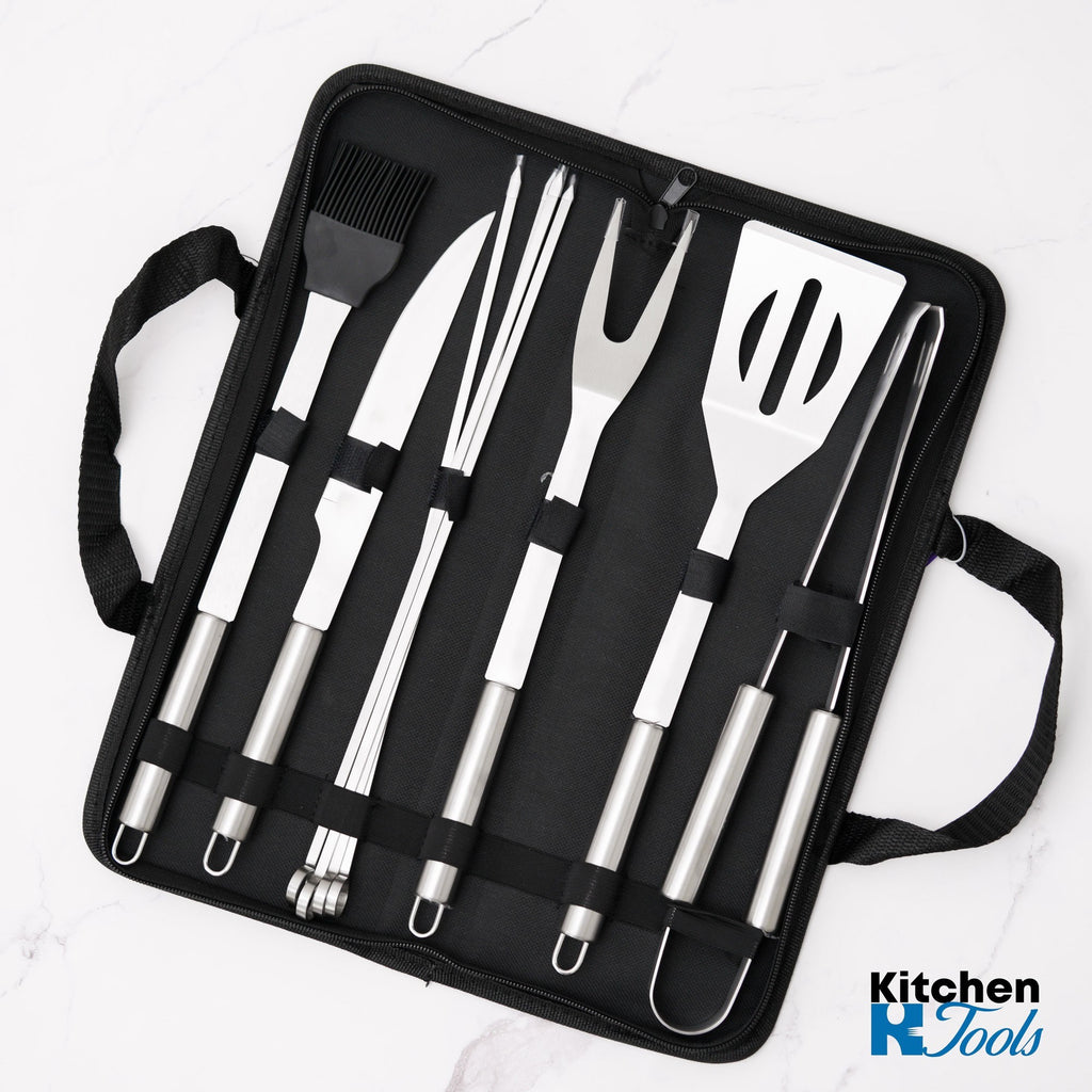 Setul nostru de 9 ustensile de grătar poate fi folosit acasă când preparați mâncăruri pe grătar, dar îl puteți lua cu dvs. când mergeți în excursii sau în vacanță. Datorită suportului cu fermoar, este portabil.