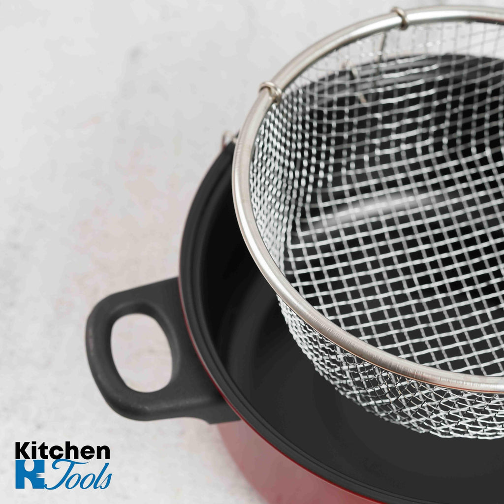 Transformă orice oală obișnuită într-o friteuză eficientă cu ajutorul acestei site din inox de înaltă calitate. Este accesoriul perfect pentru a obține cartofi prăjiți aurii, gogoși pufoase sau șnițele crocante, fără a reține excesul de ulei.