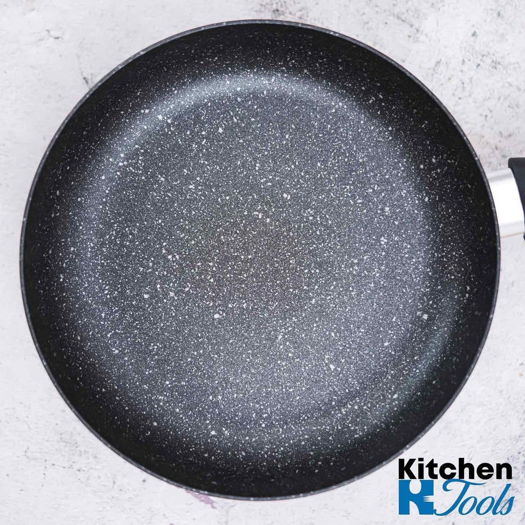 Corpul din aluminiu, cu o grosime de 2,5 mm, asigură o încălzire rapidă și o distribuție termică uniformă, prevenind arderea alimentelor în anumite zone. Interiorul este acoperit cu un strat marmorat (granit) de înaltă calitate, care oferă o antiaderență excelentă, permițând gătirea cu o cantitate minimă de grăsimi și o curățare rapidă.