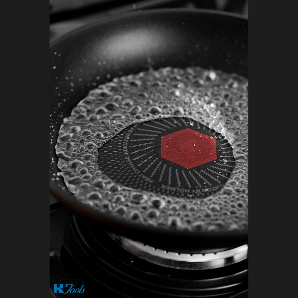 - Senzor inteligent de temperatură: Bulina roșie de pe suprafața tigăii devine intens roșie atunci când aceasta atinge temperatura optimă de gătit, garantând rezultate perfecte de fiecare dată.