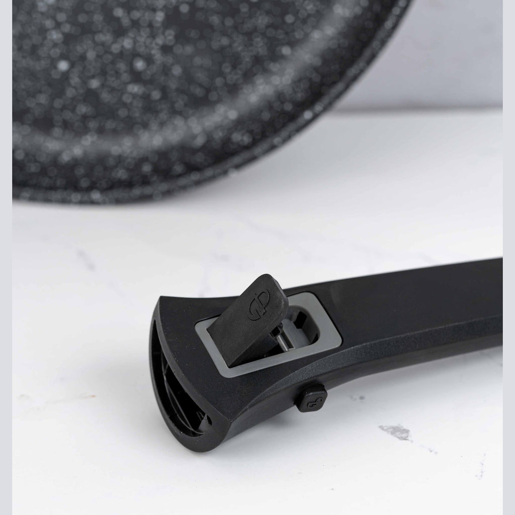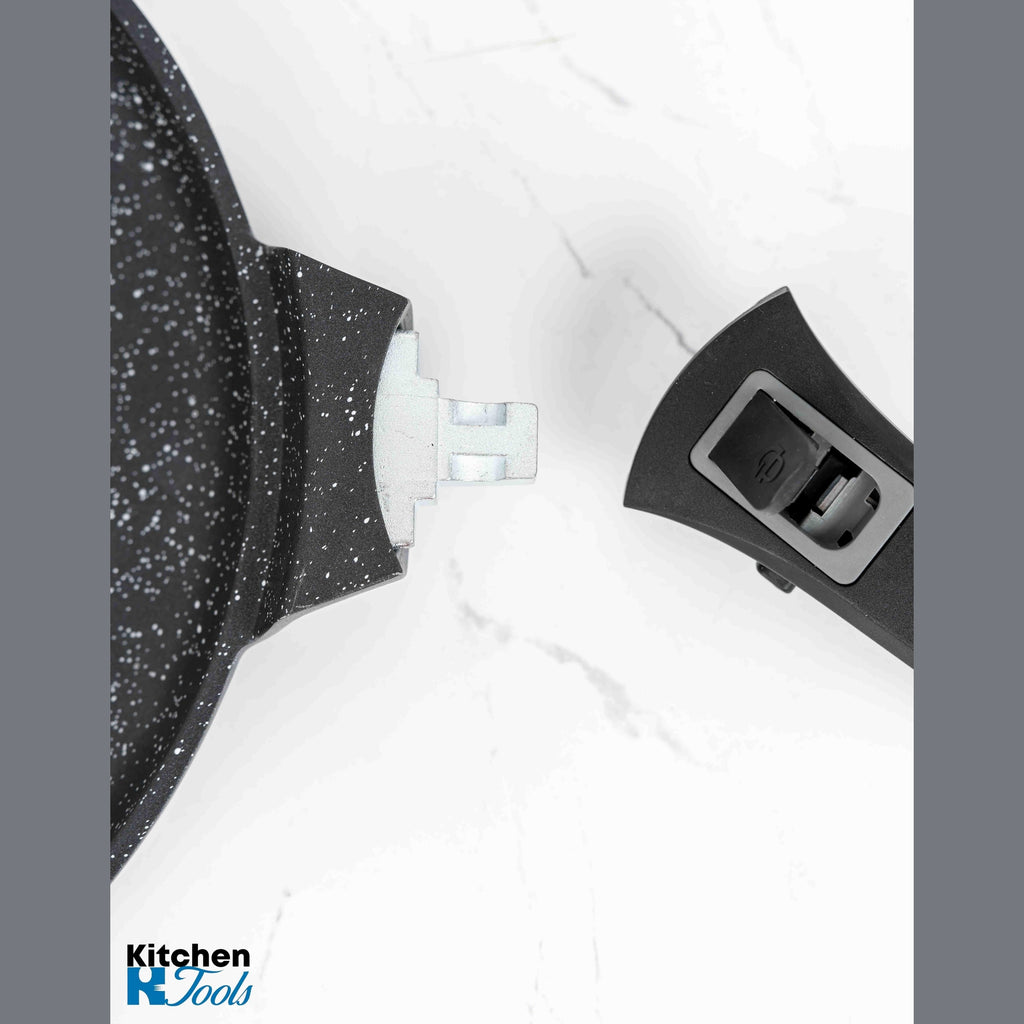 - Mânere detașabile pentru confort maxim: Mânerele detașabile sunt concepute pentru a vă oferi flexibilitate în timpul procesului de gătit. Această funcționalitate vă permite să transferați tigaia direct de pe plită la masă sau să o depozitați cu ușurință în spații restrânse.