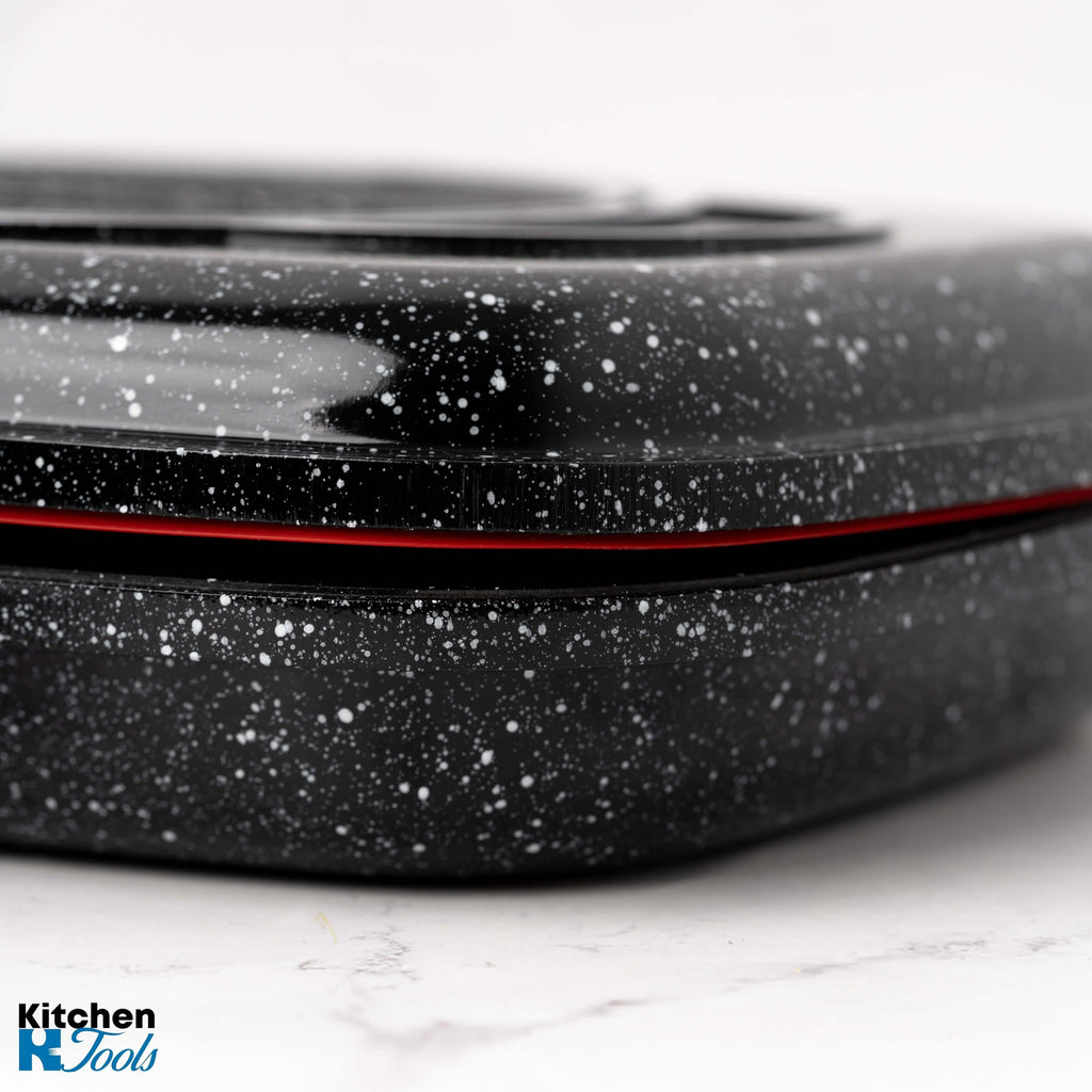 - Design dublu: capace pe ambele părți, pentru eficiență în gătit și economie de spațiu.