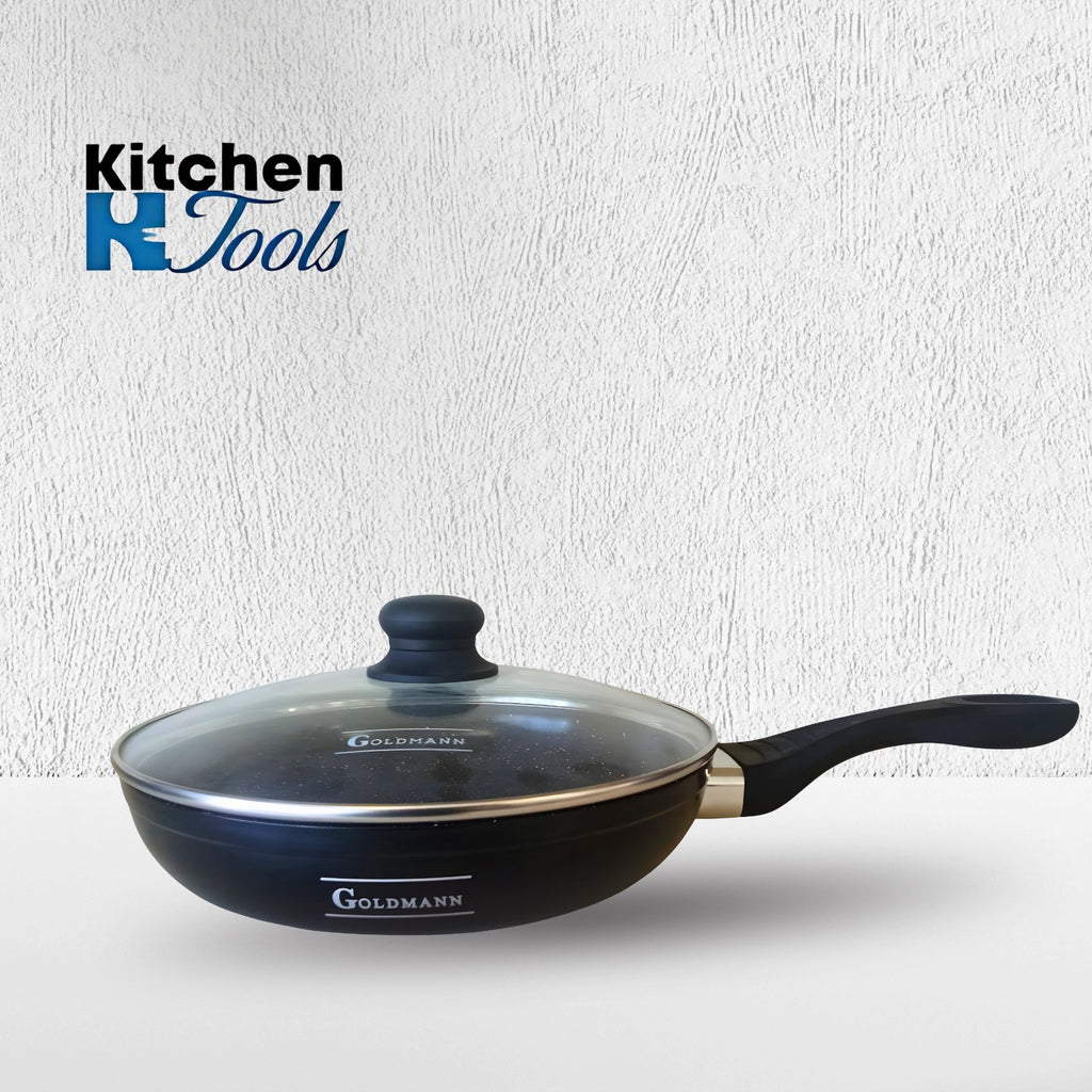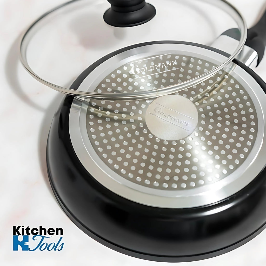 Tigaia Goldmann cu capac este un instrument de gătit esențial, conceput pentru a vă ajuta să preparați mâncăruri delicioase și sănătoase. Fabricată din aluminiu forjat de înaltă calitate și cu un interior antiaderent din marmură, această tigaie oferă performanțe excelente și rezistență în utilizarea pe termen lung. Este potrivită pentru gătitul fără exces de grăsimi, datorită suprafeței sale antiaderente.