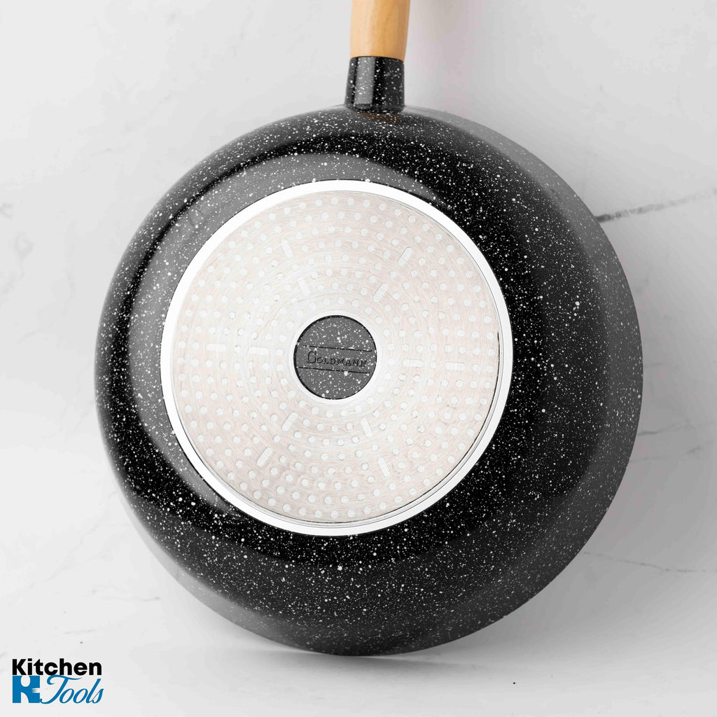 - Acoperire ceramică marmorată: Suprafața interioară este acoperită cu un strat ceramic marmorat, oferind o rezistență crescută la lipire și facilitând gătitul fără grăsimi.
